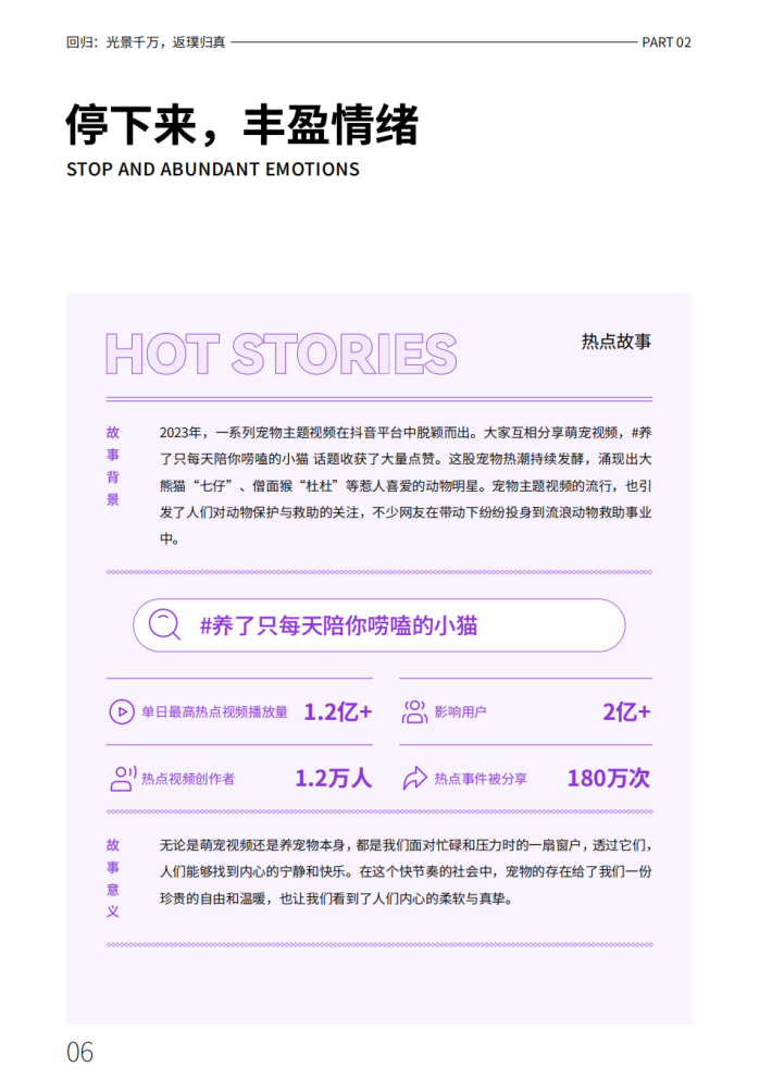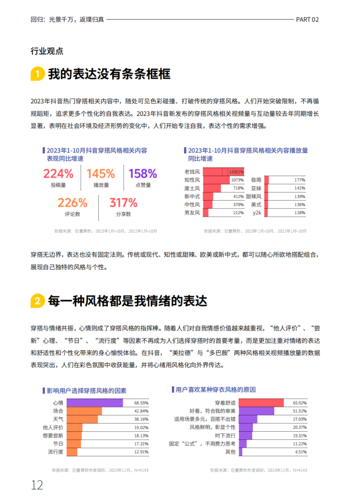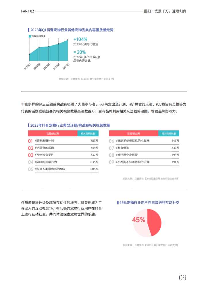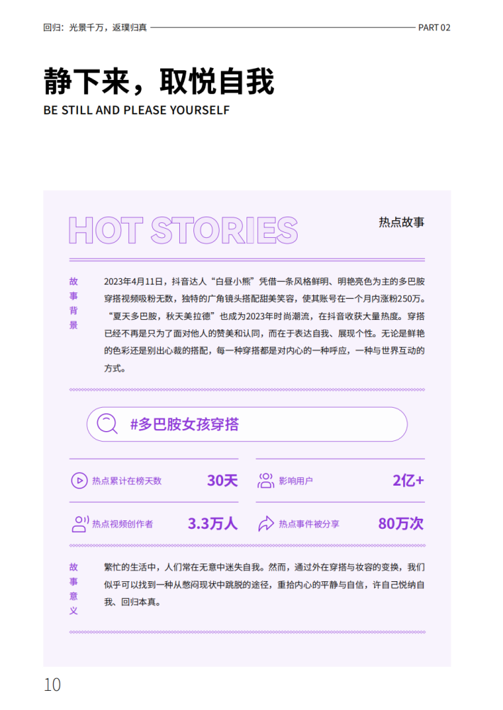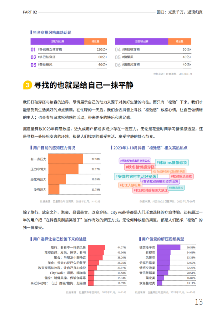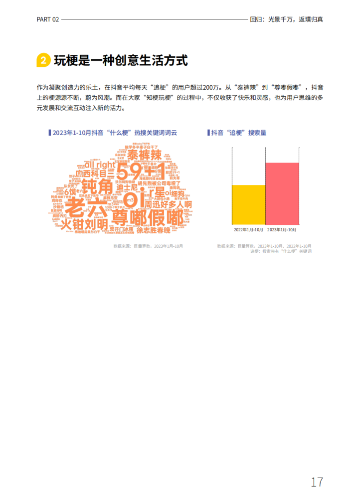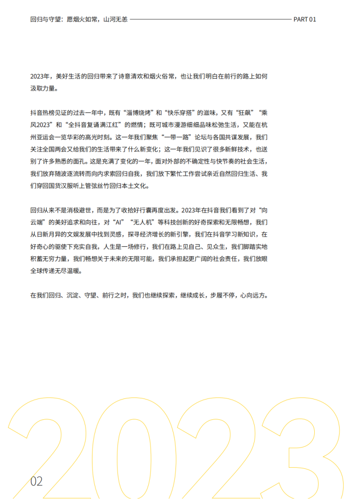 回归从来不是消极避世,而是为了收拾好行囊再度出发。2023年在抖音我们看到了对“向云端”的美好追求和向往,对“Al” “无人机”等科技创新的好奇探索和无限畅想,我们从日新月异的文娱发展中找到灵感,探寻经济增长的新引擎,我们在抖音学习新知识,在好奇心的驱使下充实自我,人生是一场修行,我们在路上见自己、见众生,我们脚踏实地积蓄无穷力量,我们畅想关于未来的无限可能,我们承担起更广阔的社会责任,我们放眼全球传递无尽温暖。
