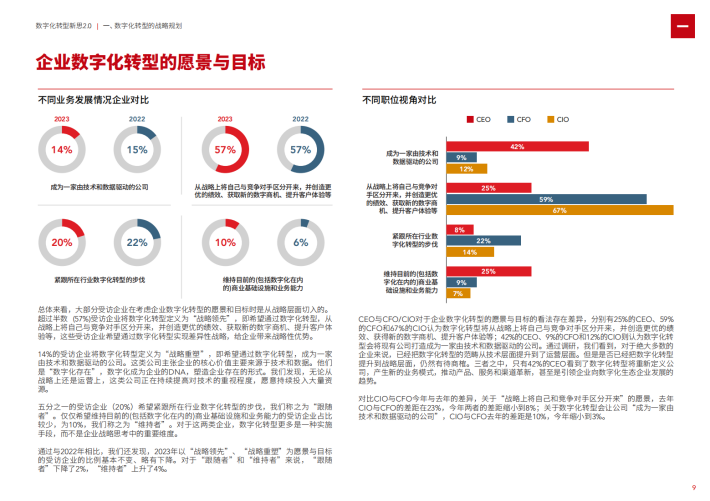 从整体情况中,我们看到,大部分管理层认为公司做数字化转型是为了主动出击、寻求发展,少部分则认为是顺势而为、解决问题。对比不同职位视角,我们发现,相比于CIO(10%)),更多的CEO(42%)和CFO(31%)选择了“顺势而为”,期望数字化解决部分业务问题,可以看出CEO和CFO更加看重部署数字化能力的恰当性、以及和业务的相关性。CIO与CEO/CFO之间的看法存在一定差异。84%的CIO(图表中79%和5%相加)认为公司在主动进行数字化转型来解决企业生存、发展问题,这一比例CFO是66%(图表中63%和3%相加),CEO是58%。