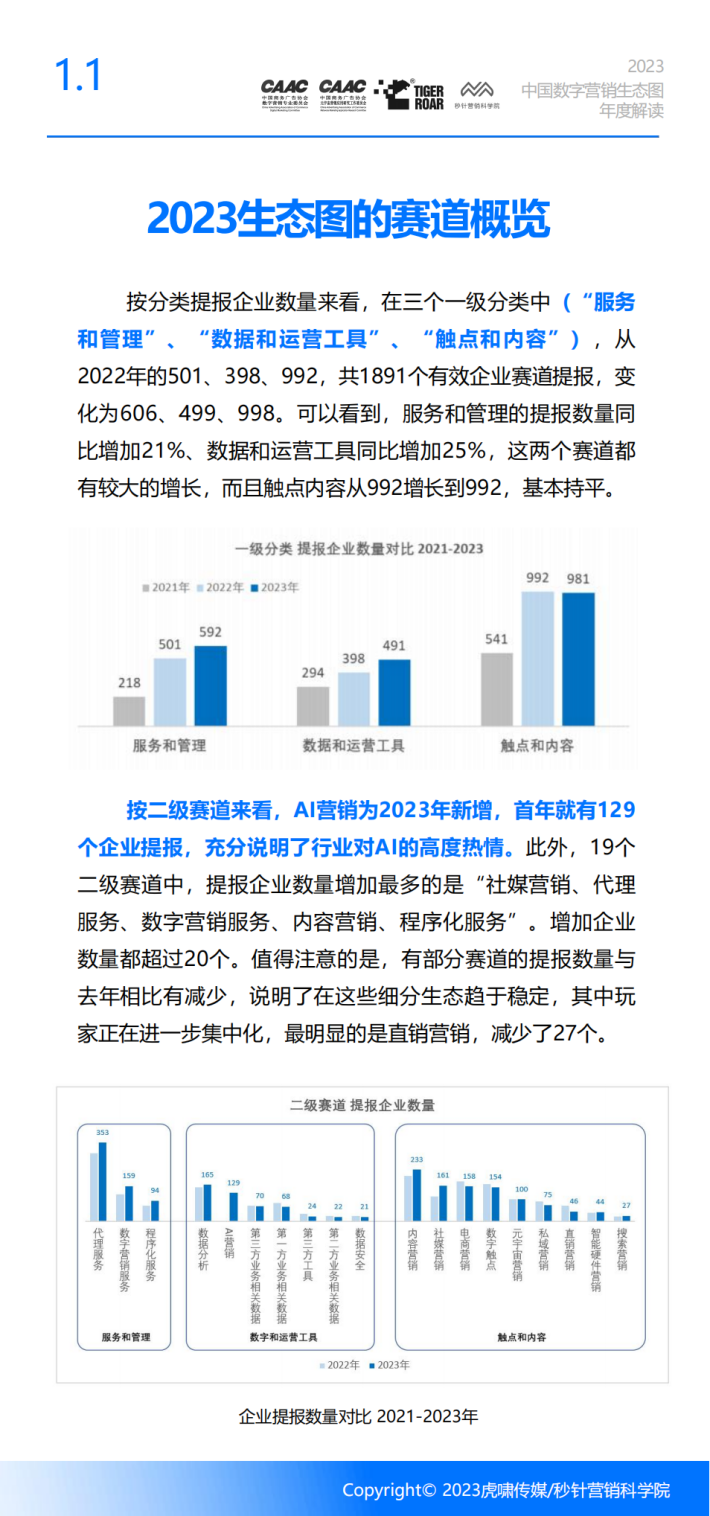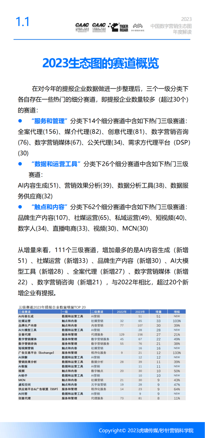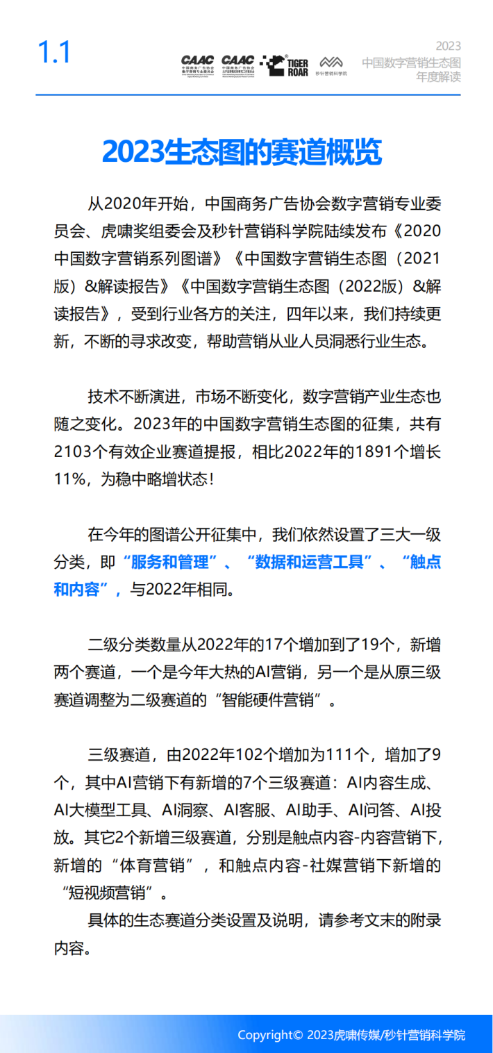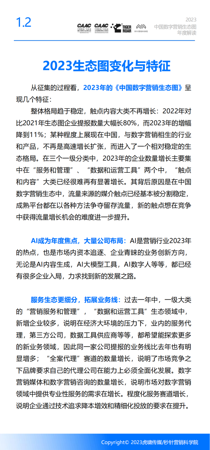 与《中国数字营销生态图(2023版)》相配合,结合行业专家访谈,本年度的解读报告,我们会重点总结2023年度中国数字营销行业发生的重要变化,同时展望新技术、新人群带来的发展新机遇,为营销从业者更全面地了解当下的数字营销生态提供参考,同时为期望为大家探索新机遇带来启发。