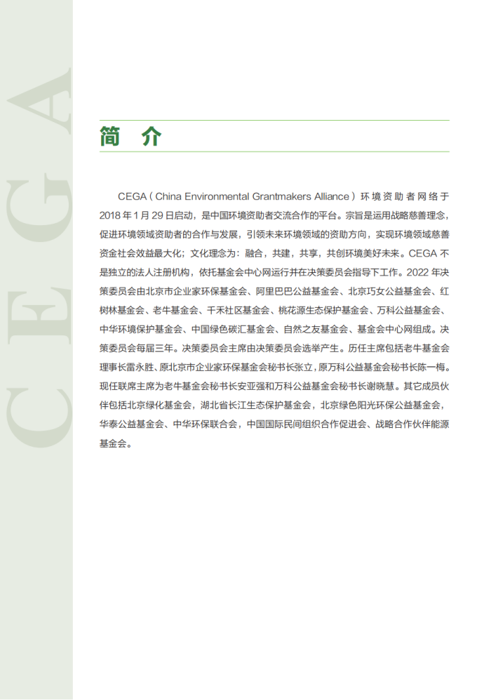 CEGA环境资助者网络成立于2018年1月29日。我们的宗旨是运用战略慈善理念,促进环境领域资助者的合作与发展,引领未来环境资助方向、实现环境领域慈善资金社会效益最大化。CEGA由中国最具影响力的环境基金会组成。各基金会在各自的工作实践中积累了丰富的经验、取得了丰硕的成果,我们曾在2019年出版过《CEGA案例精选》,首次将中国环境基金会的优秀实践编辑成册,并广为传播。