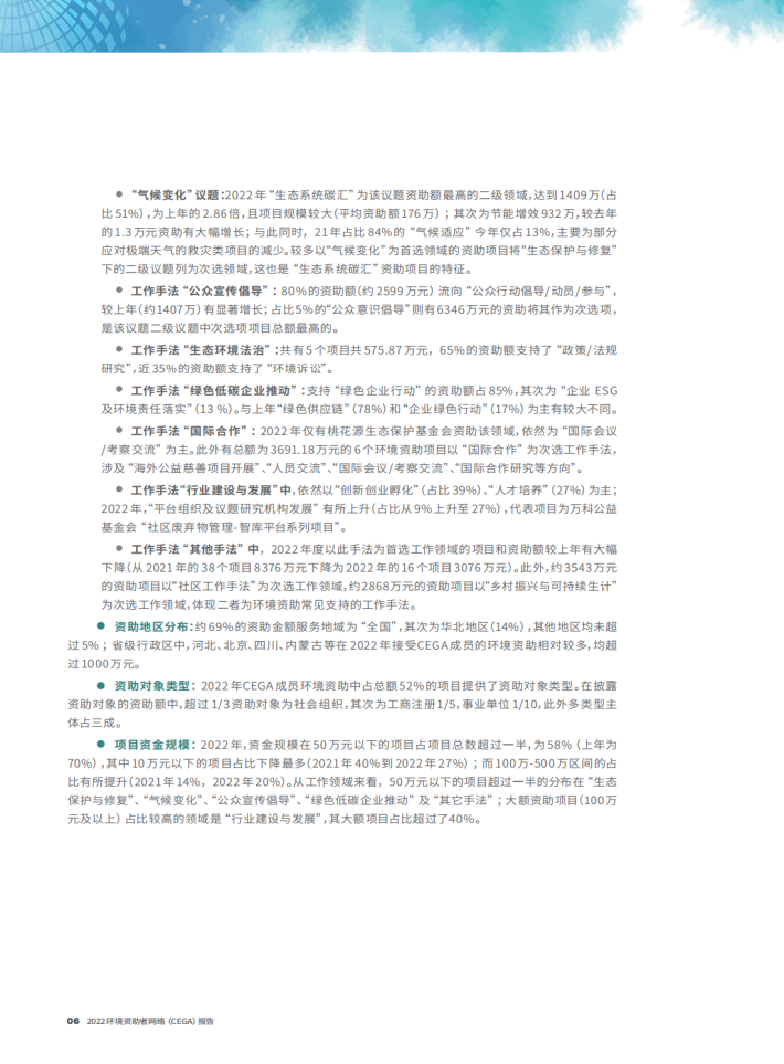 ●备领域资助金额和资助方数量:3大生态环境议题中,“生态保护与修复”历来获得资助最多,2022年获得9家CEGA成员资助,总额12,498万元,较上年的8674万有大幅捉高,在年度资助总额中占比44%;其次为“气候变化”,6家CEGA成员资助,总额2749万元,较上年3030万略有下降;“污染防治”,3家CEGA成员资助,总额1098万元,与上年基本特平。6大工作手法中,“其它手法”(如社区工作手法、生态补偿、多村振兴与可传簇生计)获得资助为4076万元,占14%;其次是“公众宣传倡导(3095万元)、“行业建设与发展”(2723万元)、“绿色低酸企业推动”(1519万元);“国际合作”和“生态环境法治”获得资助不足一干万元。