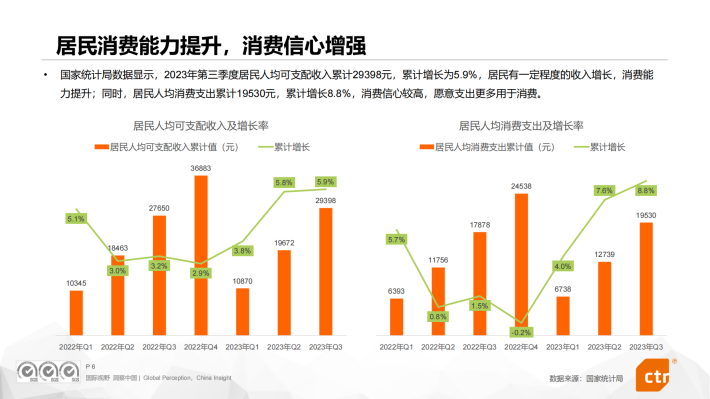 国家统计局数据显示,2023年第三季度居民人均可支配收入累计29398元,累计增长为5.9%,居民有一定程度的收入增长,消费能力提升;同时,居民人均消费支出累计19530元,累计增长8.8%,消费信心较高,愿意支出更多用于消费。