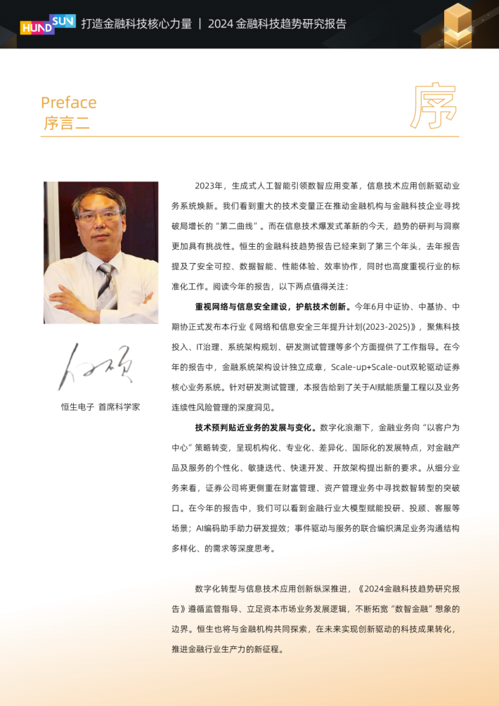 2023年,生成式人工智能引领数智应用变革,信息技术应用创新驱动业务系统焕新。我们看到重大的技术变量正在推动金融机构与金融科技企业寻找破局增长的“第二曲线”。而在信息技术爆发式革新的今天,趋势的研判与洞察更加具有挑战性。恒生的金融科技趋势报告已经来到了第三个年头,去年报告提及了安全可控、数据智能、性能体验、效率协作,同时也高度重视行业的标准化工作。阅读今年的报告,以下两点值得关注: