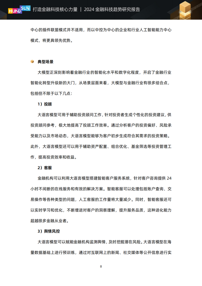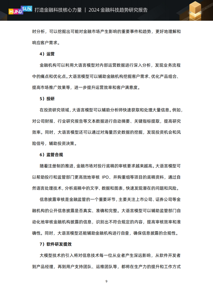 技术预判贴近业务的发展与变化。数字化浪潮下,金融业务向“以客户为中心”策略转变,呈现机构化、专业化、差异化、国际化的发展特点,对金融产品及服务的个性化、敏捷迭代、快速开发、开放架构提出新的要求。从细分业务来看,证券公司将更侧重在财富管理、资产管理业务中寻找数智转型的突破口。在今年的报告中,我们可以看到金融行业大模型赋能投研、投顾、客服等场景;Al编码助手助力研发提效;事件驱动与服务的联合编织满足业务沟通结构多样化、的需求等深度思考。