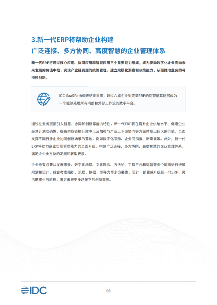 新一代ERP针对技术架构升级、数据能力建设以及业务价值提升等问题进行了全面重构,为数字化企业打开了全新的能力增长空间。与传统ERP聚焦企业内部财务与生产环节不同,新一代ERP将赋能目标扩展至企业的内外部和上下游,旨在帮助企业打造一个全链协同的供应链运行体系,不断增强各环节的处置效率、协同能力和智能化水平。