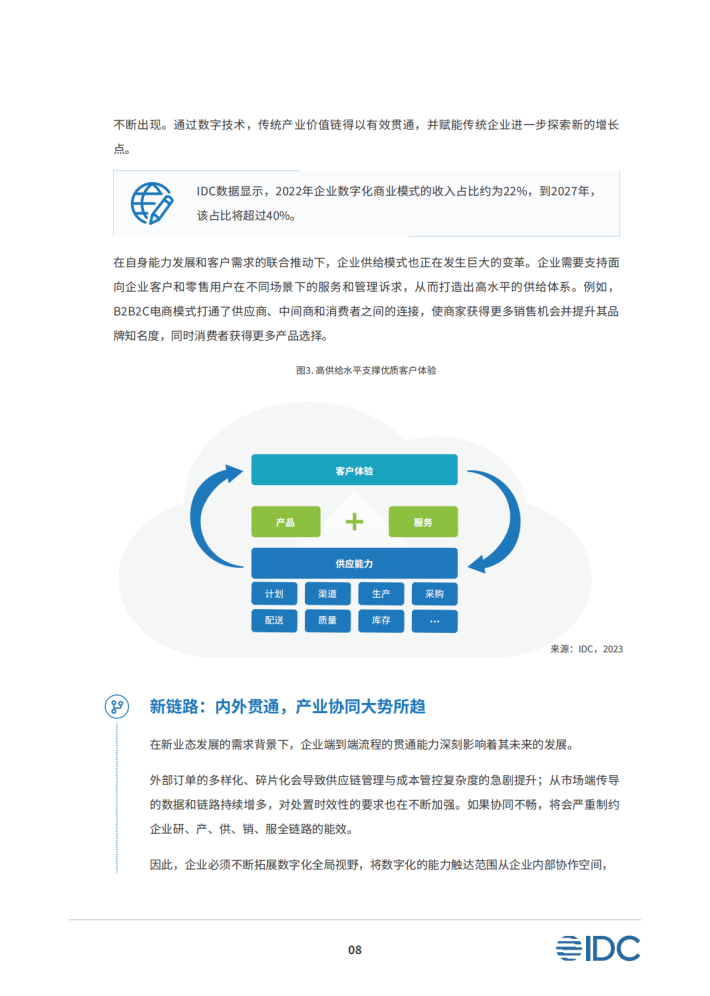 在政策、技术、创新和生态的多重驱动作用下,数字化企业的运营形态、经营链路以及管理模式都在发生深刻的变化。数字化的广泛连接和信息交换能力,使传统B端和C端市场的清晰界限变得模糊,企业在面向终端用户的布局上,将更加趋向于跨界融合下的全场景覆盖,从而使商业模式不断获得创新。同时,供应链和市场端的管控难度在不断提升,故企业端到端的全链路贯通能力变得更加重要,全链路协同水平将深刻影响企业未来的发展空间。此外,数字化时代的企业管理理念也需要持续升级,从以产品为中心的单一价值导向,转为以客户为中心的价值重构,进而寻求多方共赢。
