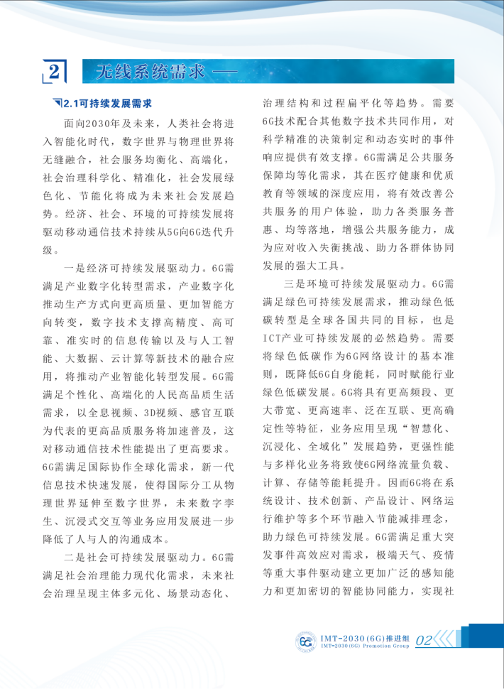 面向2030年及未来,人类社会将进入智能化时代,数字世界与物理世界将无缝融合,社会服务均衡化、高端化,社会治理科学化、精准化,社会发展绿色化、节能化将成为未来社会发展趋势。经济、社会、环境的可持续发展将驱动移动通信技术持续从5G向6G迭代升级。