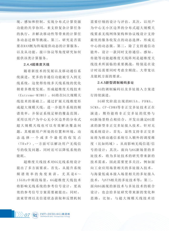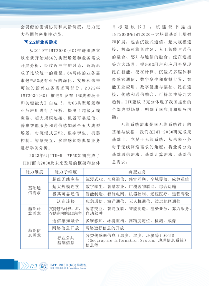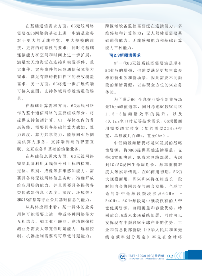 一是经济可持续发展驱动力。6G需满足产业数字化转型需求,产业数字化推动生产方式向更高质量、更加智能方向转变,数字技术支撑高精度、高可靠、准实时的信息传输以及与人工智能、大数据、云计算等新技术的融合应用,将推动产业智能化转型发展。6G需满足个性化、高端化的人民高品质生活需求,以全息视频、3D视频、感官互联为代表的更高品质服务将加速普及,这对移动通信技术性能提出了更高要求。6G需满足国际协作全球化需求,新一代信息技术快速发展,使得国际分工从物理世界延伸至数字世界,未来数字孪生、沉浸式交互等业务应用发展进一步降低了人与人的沟通成本。
