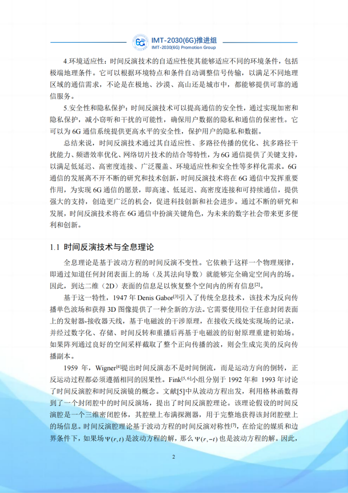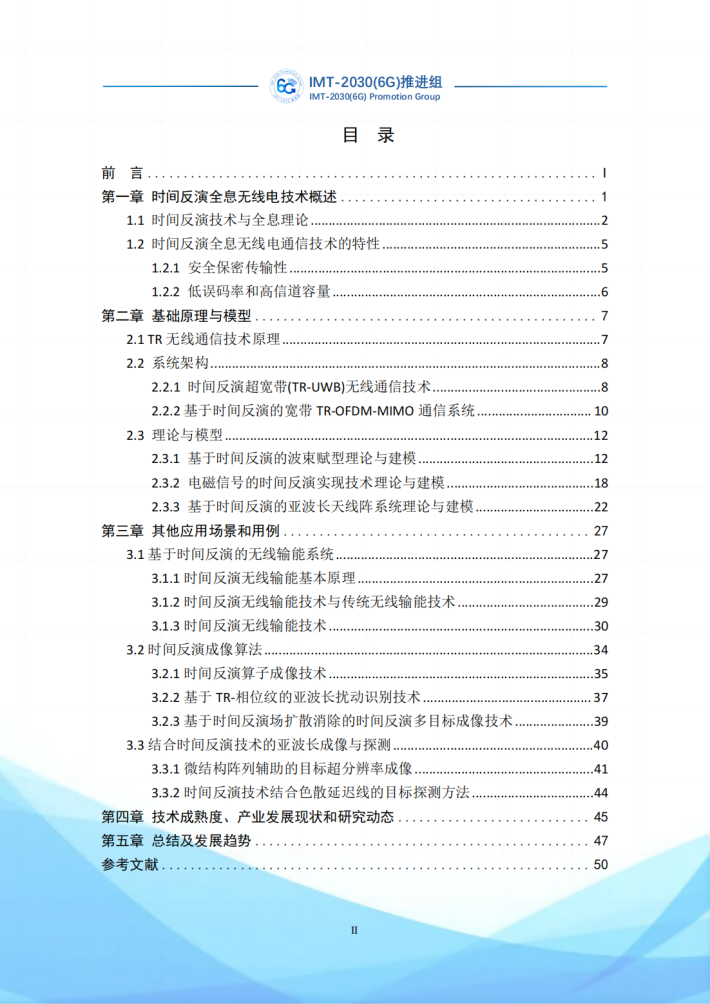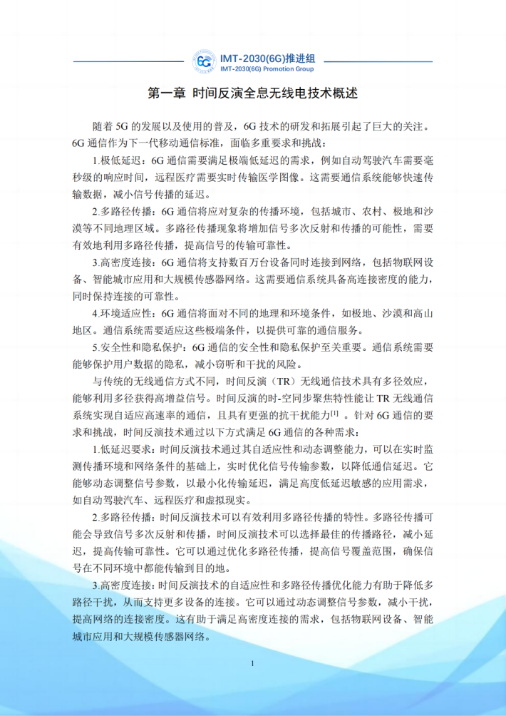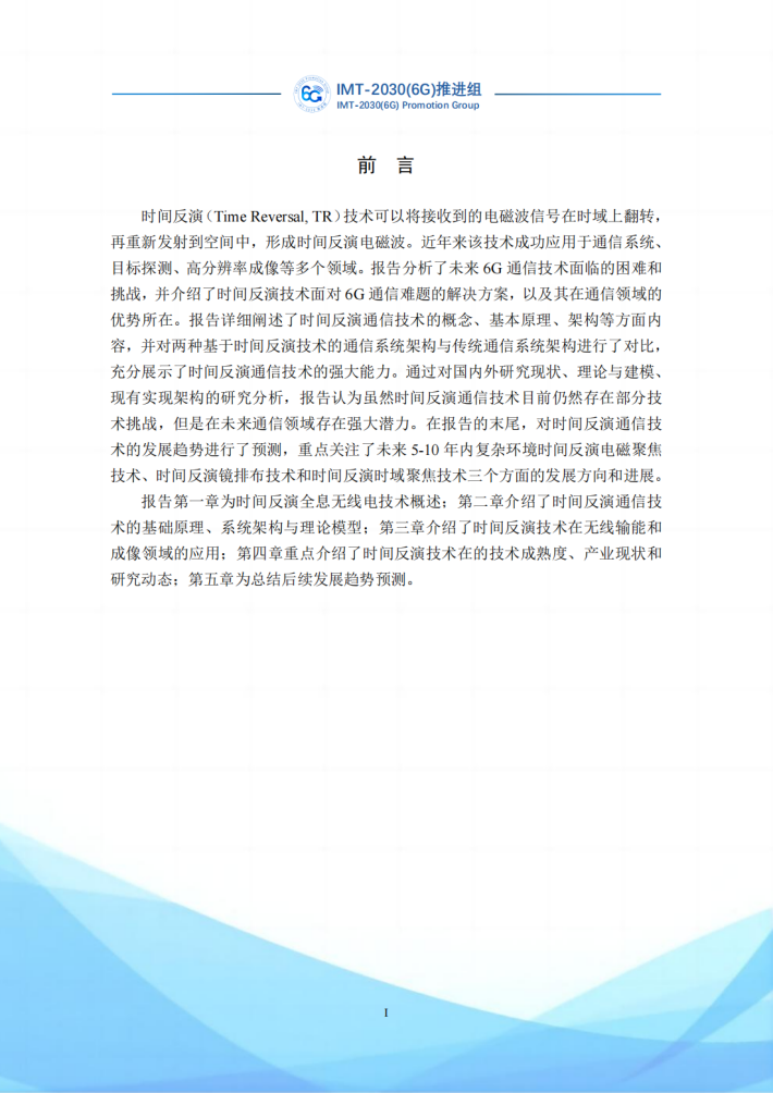 报告第一章为时间反演全息无线电技术概述;第二章介绍了时间反演通信技术的基础原理、系统架构与理论模型;第三章介绍了时间反演技术在无线输能和