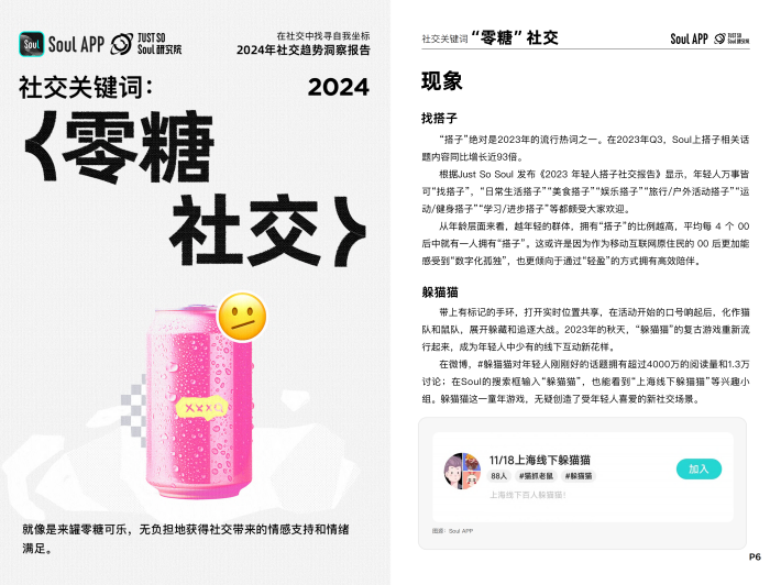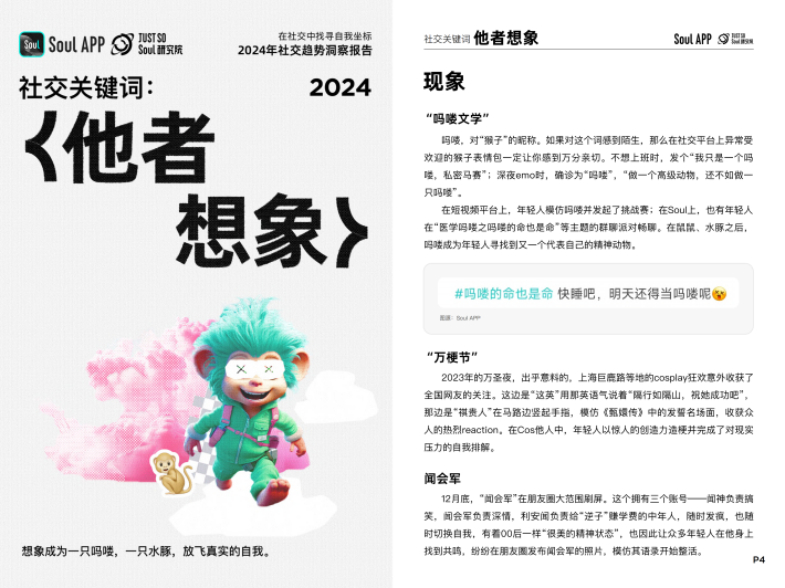 2023年,在数以亿计的瞬间和社交互动中,Soul上沉淀了个性鲜明的年轻人们生动、真实的分享和选择,以及酸甜苦辣的生活百态,成为了解当下新一代万花筒般生活潮流、文化趋势的重要窗口。
