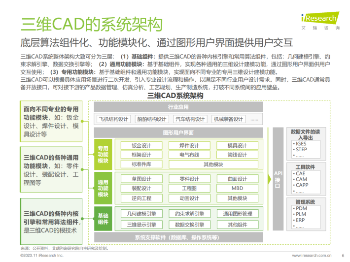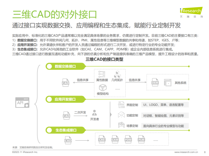三维CAD可以根据具体应用场景进行二次开发,引入专业设计流程和操作,以满足不同行业用户设计需求。同时,三维CAD通常具备开放接口,可对接下游的产品数据管理、仿真分析、工艺规划、生产制造系统,打破不同系统间的应用壁垒。