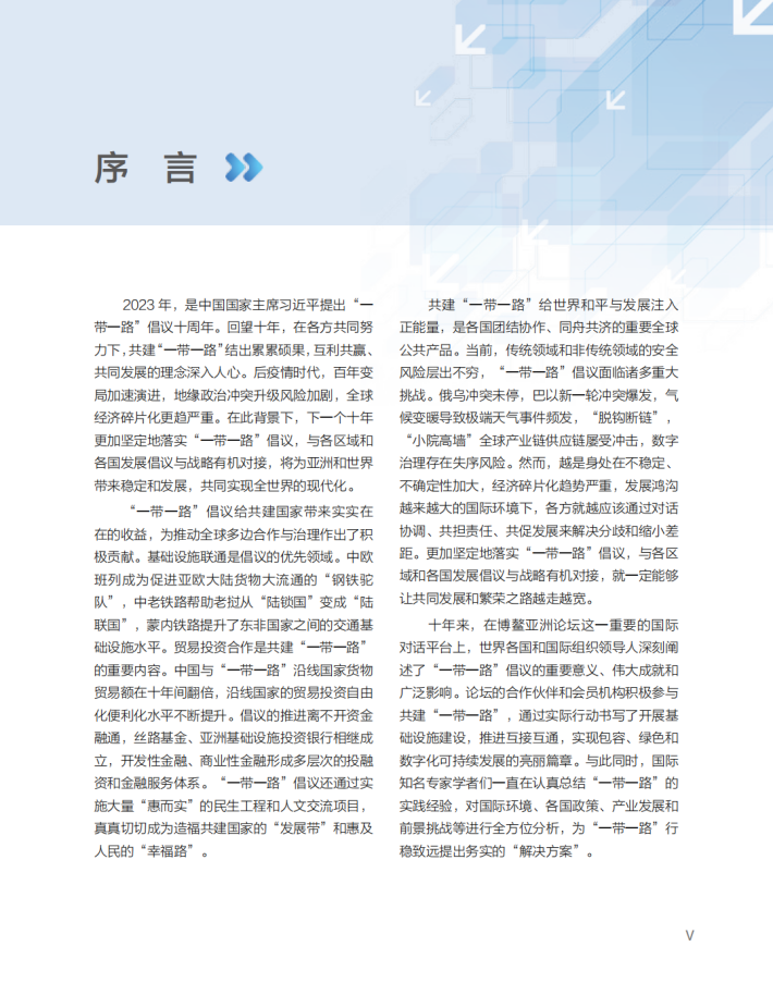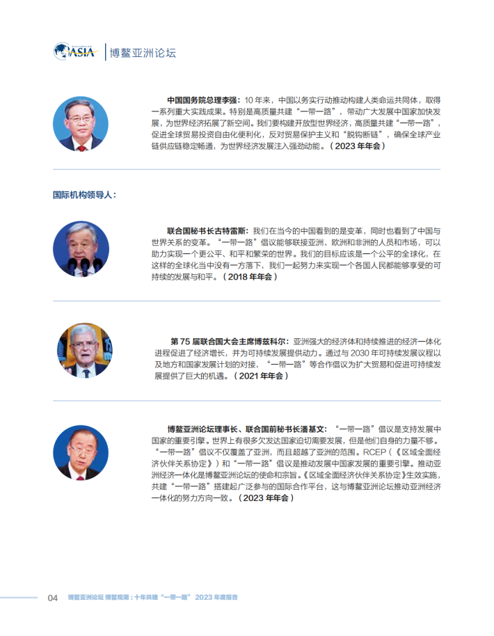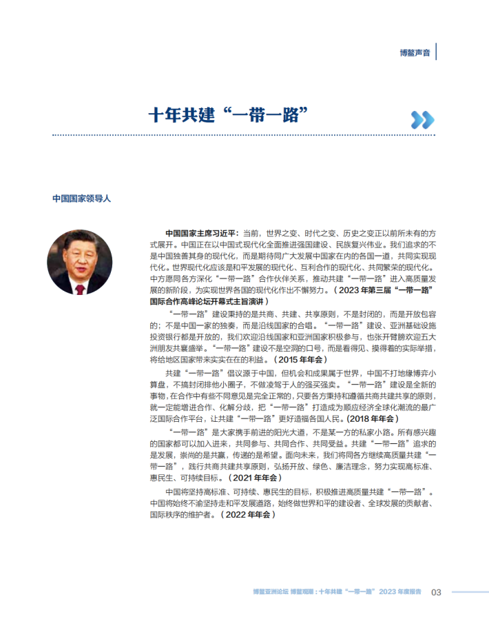 十年来,在博鳌亚洲论坛这一重要的国际对话平台上,世界各国和国际组织领导人深刻阐述了“一带一路”倡议的重要意义、伟大成就和广泛影响。论坛的合作伙伴和会员机构积极参与共建“一带一路”,通过实际行动书写了开展基础设施建设,推进互接互通,实现包容、绿色和数字化可持续发展的亮丽篇章。与此同时,国际知名专家学者们一直在认真总结“一带一路”的实践经验,对国际环境、各国政策、产业发展和前景挑战等进行全方位分析,为“一带一路”行稳致远提出务实的“解决方案”。