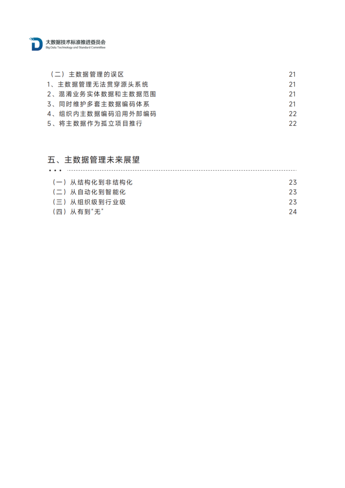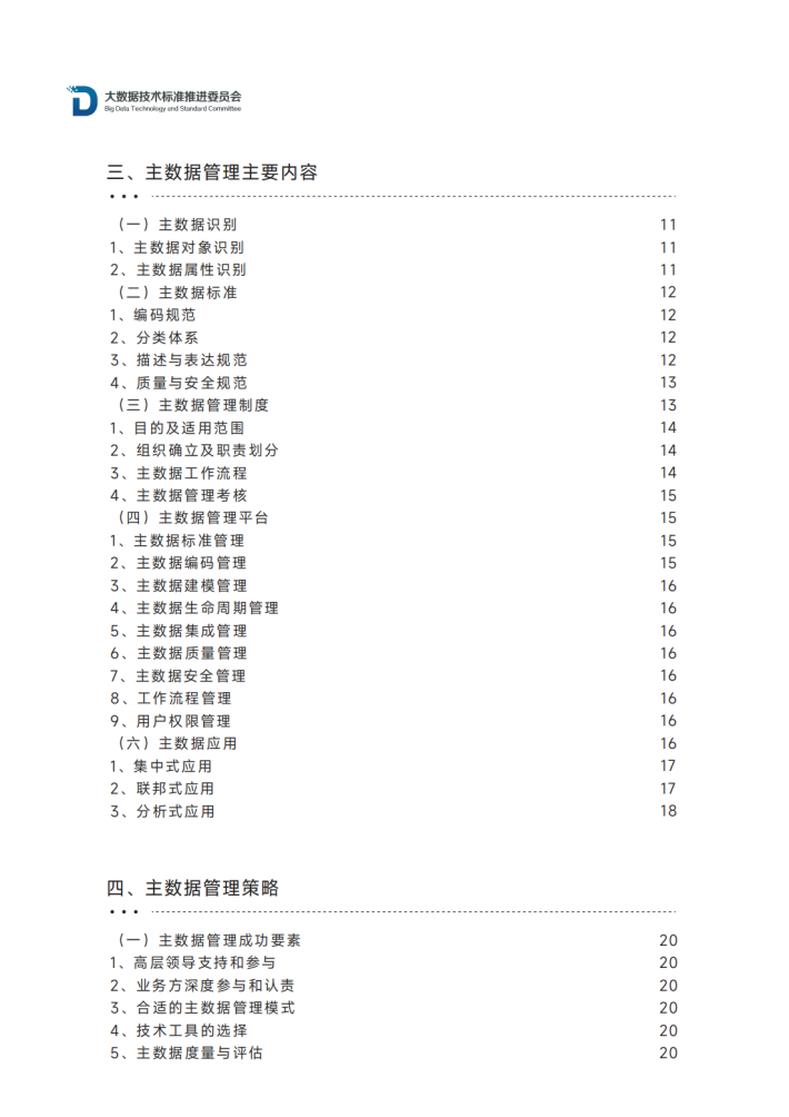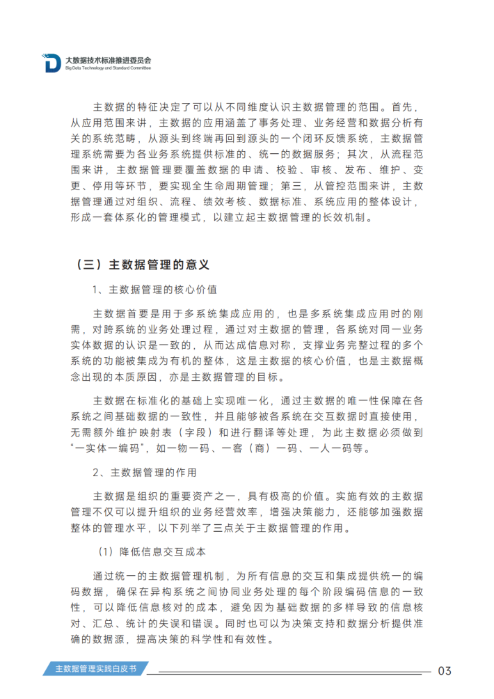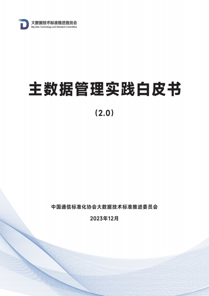2018年12月中国通信标准化协会大数据技术标准推进委员会CCSA TC601编 制发布了《主数据管理实践白皮书(1.0)》,对主数据管理的内涵、特点、实践案例进行了研究和总结,在业界得到了传播和认可。2023年12月,CCSATC601更新编制了《主数据管理实践白皮书(2.0)》版本,进一步对主数据管理的管理模式、管理策略、成功要素、发展趋势进行了更深入的研究和提炼。