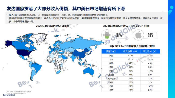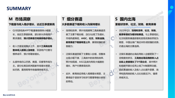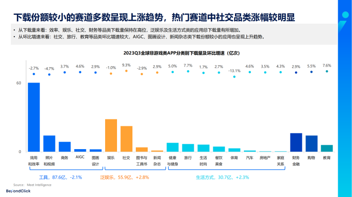效用和效率、照片和视频等工具类赛道贡献了主要下载份额,且Q3出现了负增长,市场热度降低,AIGC、社交、财务金融、教育赛道下载量明显上升,展现较强的获客能力;