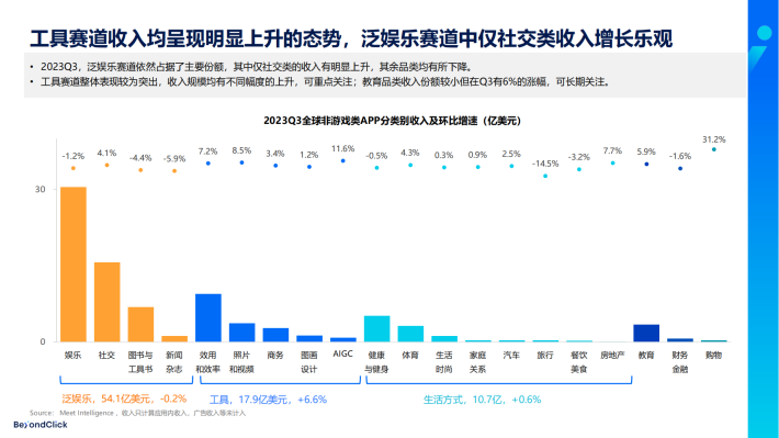 泛娱乐赛道贡献了主要收入份额,但整体出现小幅下滑,工具类中的效用和效率、照片和视频、AIGC品类均有较大幅度的增长,用户付费表现优异;