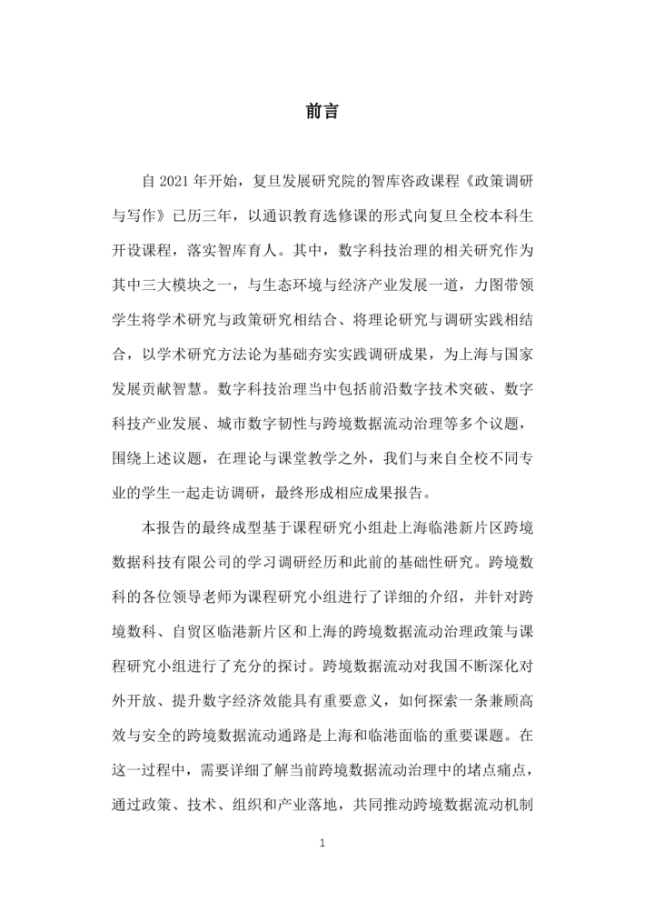 本报告的最终成型基于课程研究小组赴上海临港新片区跨境数据科技有限公司的学习调研经历和此前的基础性研究。跨境数科的各位领导老师为课程研究小组进行了详细的介绍,并针对跨境数科、自贸区临港新片区和上海的跨境数据流动治理政策与课程研究小组进行了充分的探讨。跨境数据流动对我国不断深化对外开放、提升数字经济效能具有重要意义,如何探索一条兼顾高效与安全的跨境数据流动通路是上海和临港面临的重要课题。在这一过程中,需要详细了解当前跨境数据流动治理中的堵点痛点,通过政策、技术、组织和产业落地,共同推动跨境数据流动机制创新。跨境数科的领导老师们为调研小组带来诸多重要的思考角度,并以跨境数科的跨境数据流动应用场景给予课程研究小组很大启发。小组围绕上述议题撰写了成果报告,得到了跨境数科李晶、张启心与贺维维等各位领导老师的指导与修改,在此我们表达诚挚的感谢。