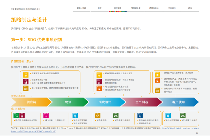 制造业在创造大量就业机会,为经济发展提供强有力的支持的同时,也是传统的高耗能、高排放行业,因此制造业的绿色发展与转型对于实现可持续发展意义重大;此外,制造业可以辐射和优化供应链管理,是创新的推动者,特别是在数智化核心竞争力、绿色产品与服务、工业互联网创新技术、智能制造业态等重点领域,对于实现可持续发展有着举足轻重的作用。面对可持续发展危机,不少制造业企业纷纷采取行动,积极推动转型升级,以对SDGs的实现做出贡献,并对如SDG7(经济适用的清洁能源)、SDG9(产业、创新和基础设施)、SDG12(负责任消费和生产)等SDGs高度关注。