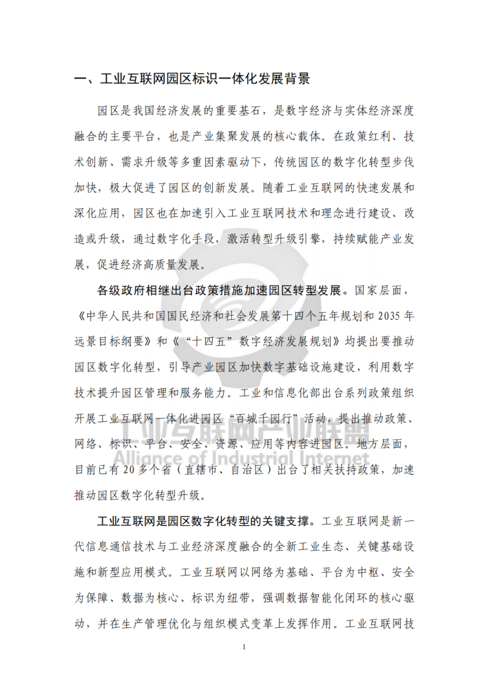 当前,工业互联网正在赋能千行百业的数字化转型,推动我国数字经济进入全面发展的新时代,并成为高质量发展的重要引擎。为巩固创新中国工业互联网发展模式,加快工业互联网高质量发展,推进新型工业化进程,工业和信息化部加强统筹协调,围绕网络是基础、平台是中枢、安全是保障、数据是核心、标识是纽带,进一步完善政策体系,出台实施标识“贯通”三年行动计划,一体推进各项工作。结合工业和信息化工业互联网一体化进园区“百城千园行”活动通知提出的政策、网络、标识、平台、安全、资源、应用等七进园区的具体内容,以及工业互联网产业联盟组织开展的园区调研,为推动工业互联网标识解析体系赋能园区转型升级,工业互联网产业联盟组织编写了《工业互联网园区标识一体化建设指南》。