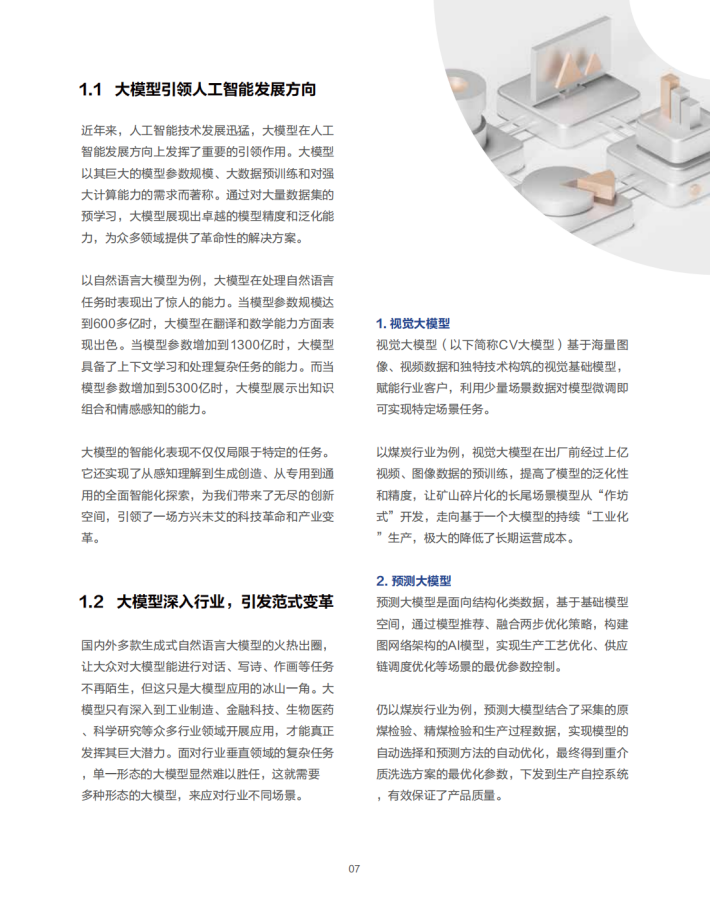 近年来,人工智能技术发展迅猛,大模型在人工智能发展方向上发挥了重要的引领作用。大模型以其巨大的模型参数规模、大数据预训练和对强大计算能力的需求而著称。通过对大量数据集的预学习,大模型展现出卓越的模型精度和泛化能力,为众多领域提供了革命性的解决方案。