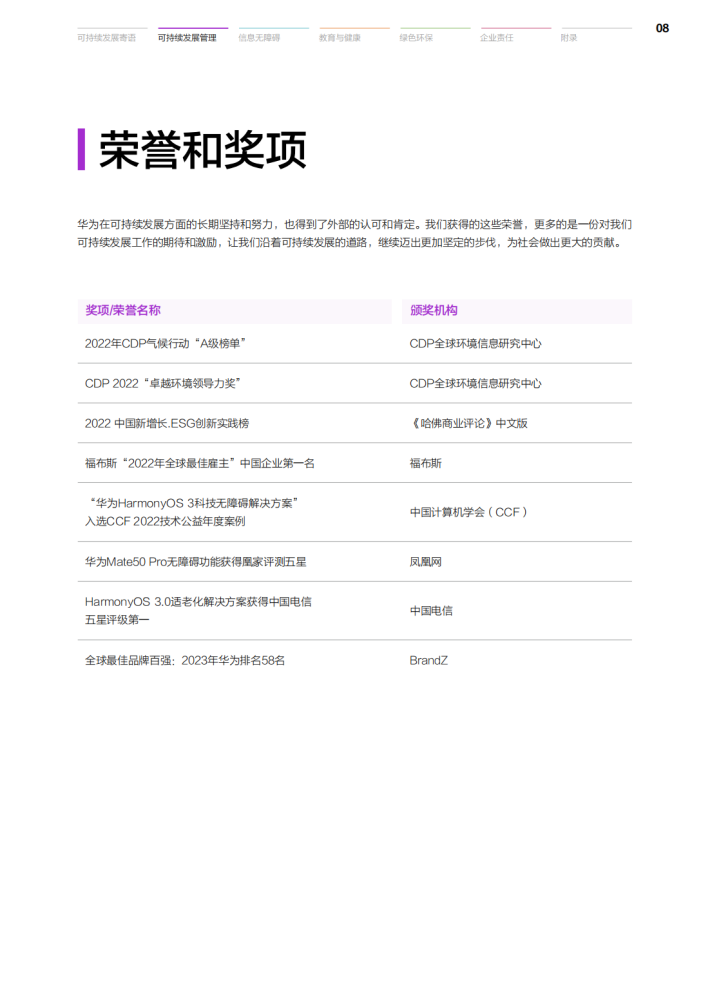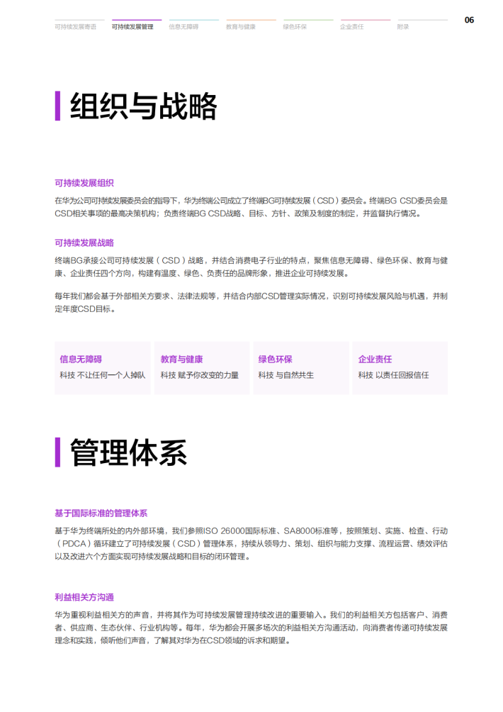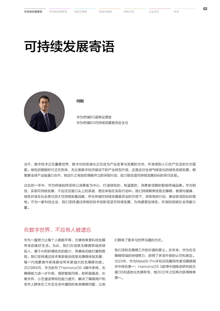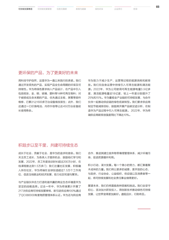 过去的一年中,华为终端始终坚持以消费者为中心,打造绿色的、有温度的、消费者信赖的智能终端品牌。华为相信,实现可持续发展,不应仅仅是口头上的承诺,更应体现在实际行动中。我们持续聚焦信息无障碍、教育与健康、绿色环保及社会责任四大可持续发展战略,并在终端可持续发展委员会的引领下,采取有效行动,推动各项目标的落地。作为一家科技企业,我们坚持通过持续的技术创新促进可持续发展,为构建更加绿色、环保的低碳社会贡献力量。