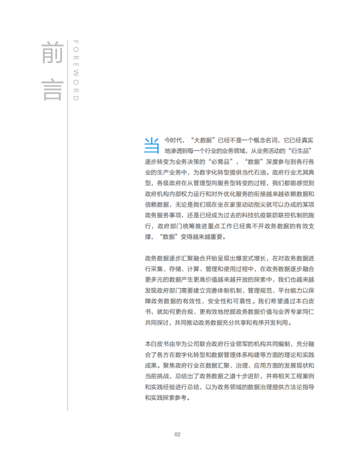 本白皮书由华为公司联合政府行业领军的机构共同编制,充分融合了各方在数字化转型和数据管理体系构建等方面的理论和实践成果。聚焦政府行业在数据汇聚、治理、应用方面的发展现状和当前挑战,总结出了政务数据之道十步进阶,并将相关工程案例和实践经验进行总结,以为政务领域的数据治理提供方法论指导和实践探索参考。