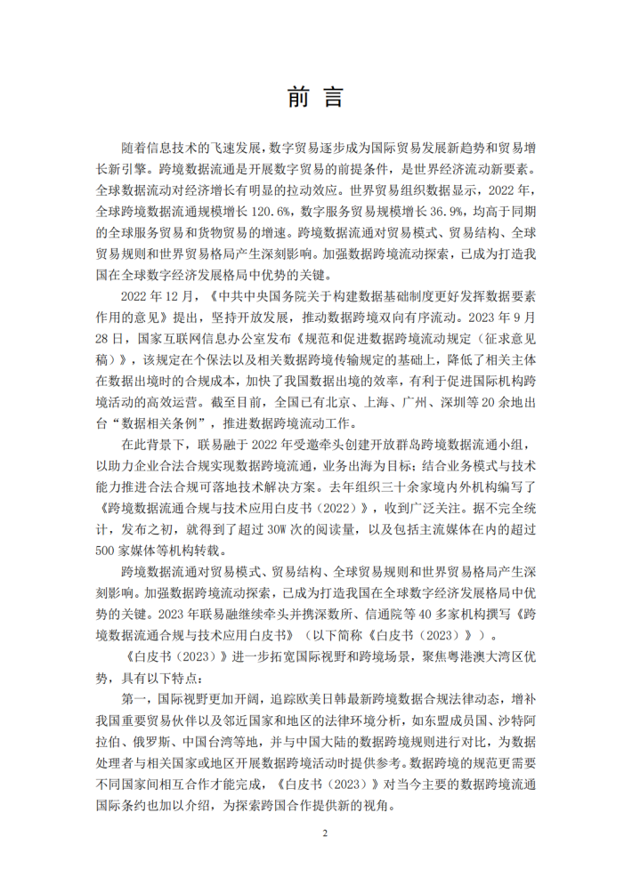 跨境数据流通对贸易模式、贸易结构、全球贸易规则和世界贸易格局产生深刻影响。加强数据跨境流动探索,已成为打造我国在全球数字经济发展格局中优势的关键。2023年联易融继续牵头并携深数所、信通院等40多家机构撰写《跨境数据流通合规与技术应用白皮书》(以下简称《白皮书(2023)》)。