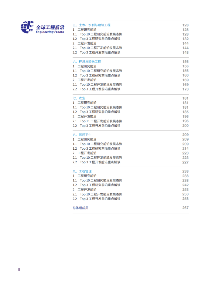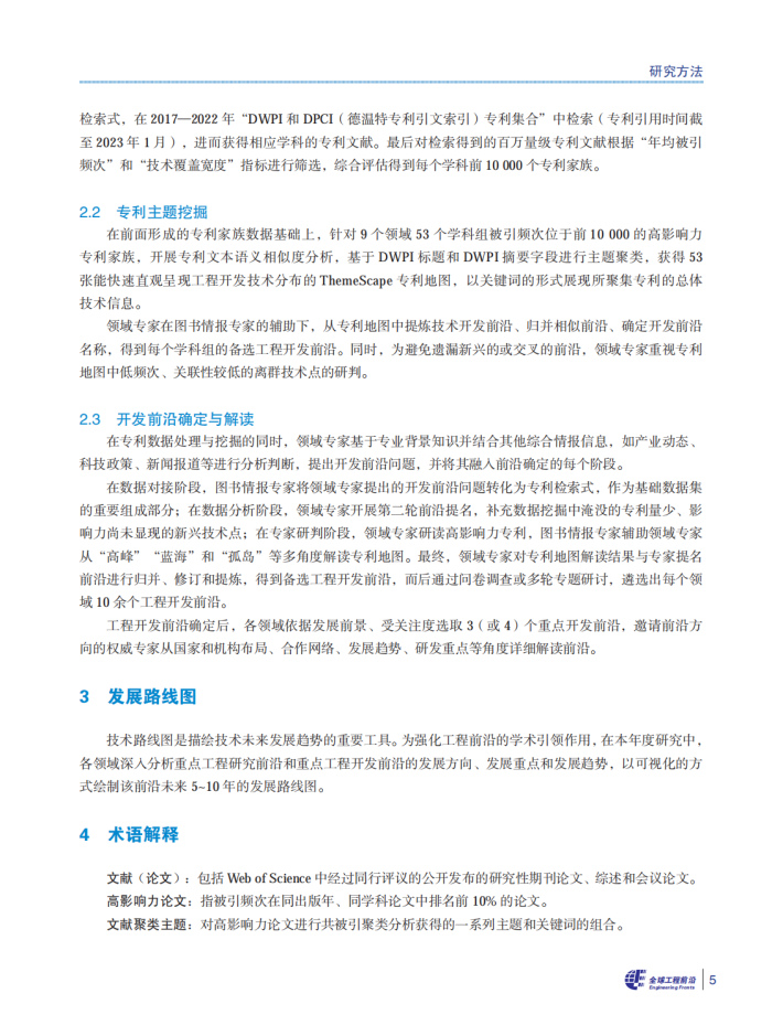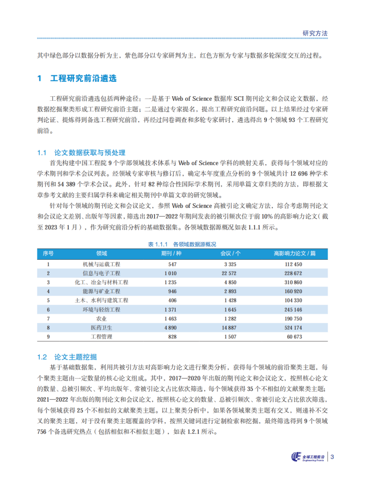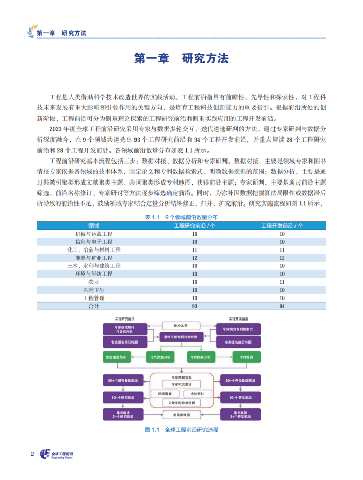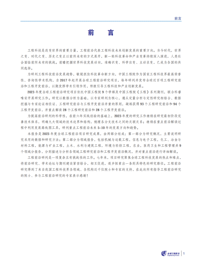 本报告是2023年度全球工程前沿项目研究成果,由两部分组成:第一部分为研究概况,主要说明研究采用的数据和研究方法;第二部分为领域报告,包括机械与运载工程,信息与电子工程,化工、冶金与材料工程,能源与矿业工程,土木、水利与建筑工程,环境与轻纺工程,农业,医药卫生和工程管理共9个领域分报告,分别描述与分析各领域工程研究前沿和工程开发前沿概况,并对重点前沿进行详细解读。工程前沿研判是一项复杂且有挑战性的工作。七年来,项目研究聚焦全球工程科技发展的热点和难点,将前沿研究、学术论坛与期刊建设紧密结合,相互促进,逐步探索出一条别具特色的研究路径。工程前沿研究得到了来自我国工程科技界各领域、各机构近千位院士和专家的支持,在此向所有指导工程前沿研究的院士、参与工程前沿研究的专家表示感谢!
