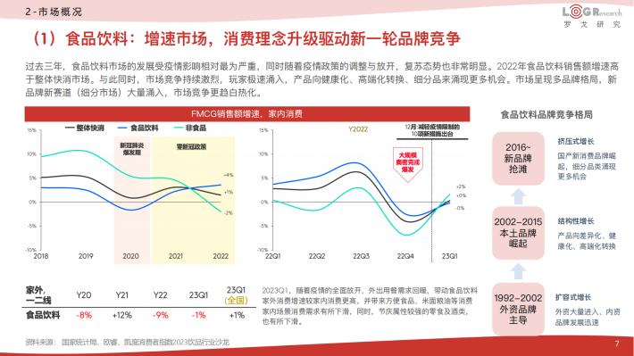 过去三年,食品饮料市场的发展受疫情影响相对最为严重,同时随着疫情政策的调整与放开,复苏态势也非常明显。2022年食品饮料销售额增速高于整体快消市场。与此同时,市场竞争持续激烈,玩家极速涌入,产品向健康化、高端化转换、细分品来涌现更多机会。市场呈现多品牌格局,新品牌新赛道(细分市场)大量涌入,市场竞争更趋白热化。