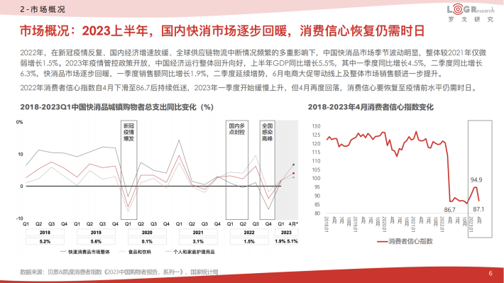 2022年,在新冠疫情反复、国内经济增速放缓、全球供应链物流中断情况频繁的多重影响下,中国快消品市场季节波动明显,整体较2021年仅微弱增长1.5%。2023年疫情管控政策开放,中国经济运行整体回升向好,上半年GDP同比增长5.5%,其中一季度同比增长4.5%,二季度同比增长6.3%,快消品市场逐步回暖,一季度销售额同比增长1.9%,二季度延续增势,6月电商大促带动线上及整体市场销售额进一步提升。