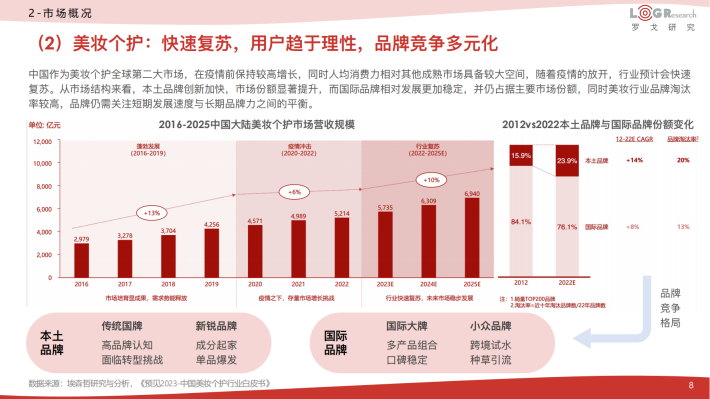 中国作为美妆个护全球第二大市场,在疫情前保持较高增长,同时人均消费力相对其他成熟市场具备较大空间,随着疫情的放开,行业预计会快速复苏。从市场结构来看,本土品牌创新加快,市场份额显著提升,而国际品牌相对发展更加稳定,并仍占据主要市场份额,同时美妆行业品牌淘汰率较高,品牌仍需关注短期发展速度与长期品牌力之间的平衡。