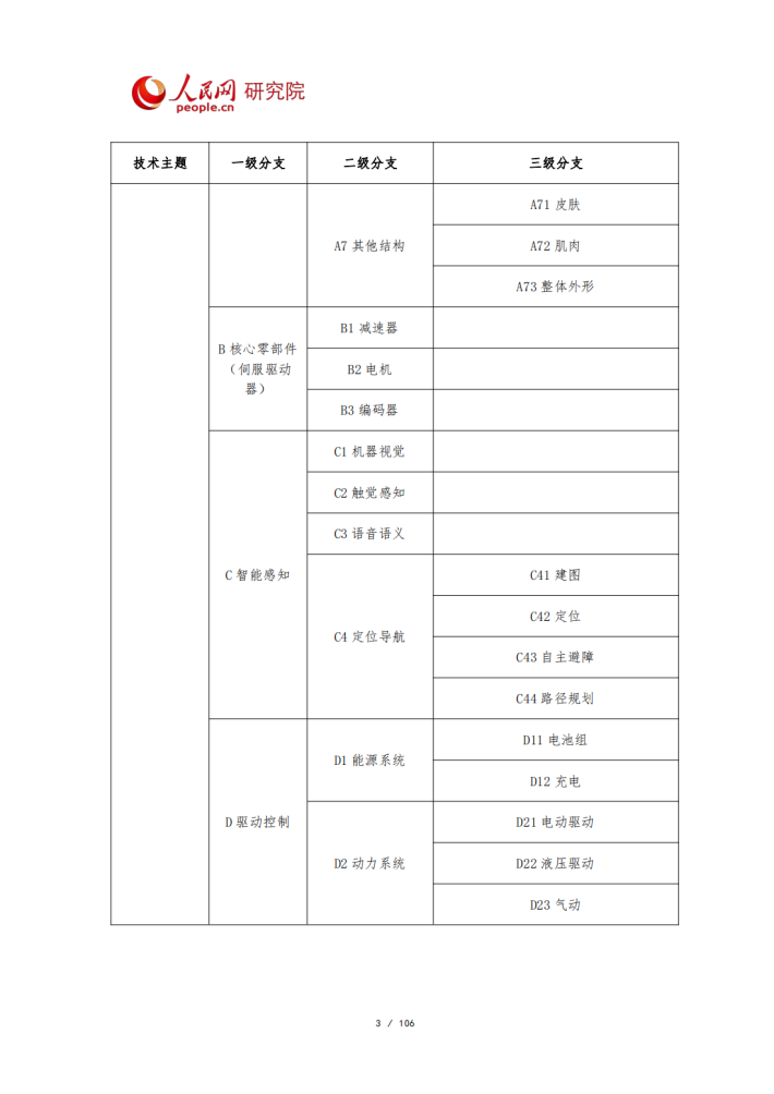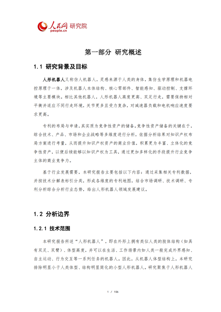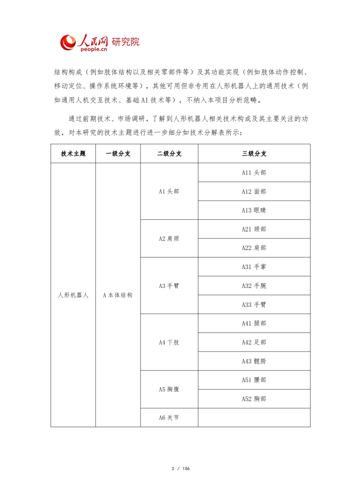 本研究报告所述“人形机器人”,即在外形上拥有类似人类的肢体结构(如具有双足、双臂)、体型高度,并可以在生活、工作场景内如人类一般完成外界感知、自主运动、行为交互等一系列任务的机器人。因此,从机器人体型结构上,本研究排除明显小于人类体型、结构明显简化的小型人形机器人。研究聚焦于人形机器人结构构成(例如肢体结构以及相关零部件等)及其功能实现(例如肢体动作控制、移动定位、操作系统环境等),其他可用但非专用在人形机器人上的通用技术(例如通用人机交互技术、基础AI技术等),不纳入本项目分析范畴。