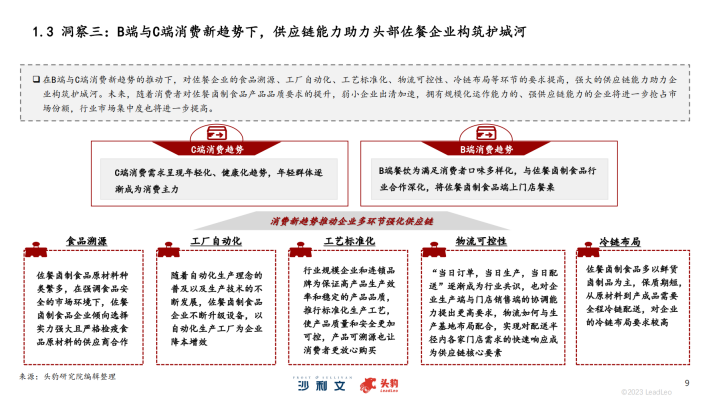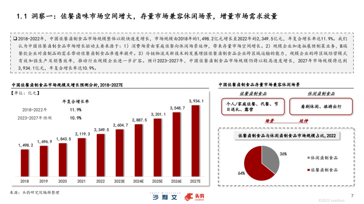 与休闲卤制品相比,作为餐来菜肴的补充,佐餐卤制食品是中华饮食文化的重要组成,消费基础更强,品类多元化,更加追求产品的新鲜和营养健康,故而行业门槛更高,相应的护城河也更稳固。同时,佐餐卤制食品正在通过扩大消费场景以及提升消费者品牌粘性,逐步占据休闲卤制品的市场,未来佐餐卤制食品市场将进一步扩容。