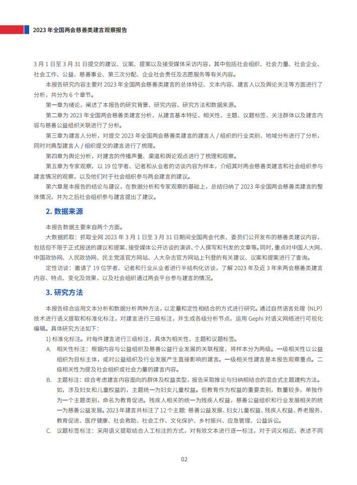 2022年,真爱梦想和善达舆情共同抓取和分析2022年全国两会慈善类建言内容,编写了《2022年全国两会慈善类建言观察报告》。2023年,我们引进了自然语言处理(NLP)技术,联合多家深耕不同议题领域的公益同行,一同探索Al技术在促进公益慈善事业发展中的可能性。