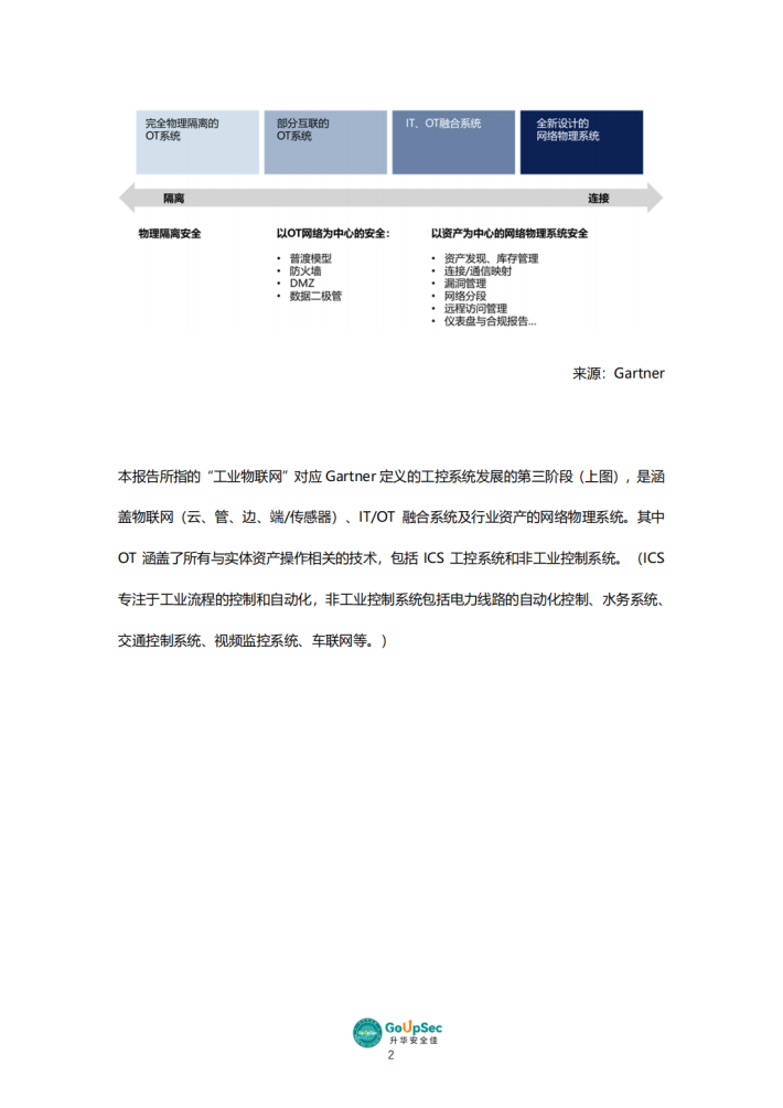 本报告所指的“工业物联网”对应Gartner定义的工控系统发展的第三阶段(上图),是涵盖物联网(云、管、边、端/传感器)、IT/OT融合系统及行业资产的网络物理系统。其中OT涵盖了所有与实体资产操作相关的技术,包括ICS工控系统和非工业控制系统。 (ICS专注于工业流程的控制和自动化,非工业控制系统包括电力线路的自动化控制、水务系统、交通控制系统、视频监控系统、车联网等。)