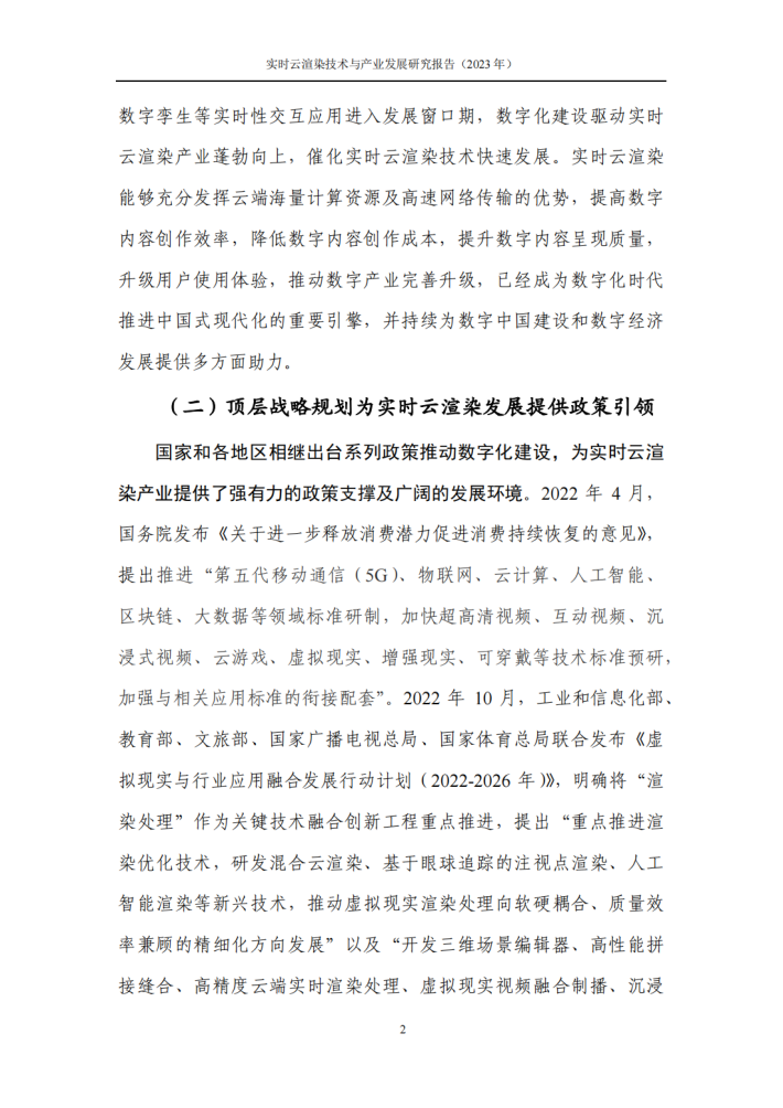 当前,国际形势错综复杂,百年变局加速演进,全球主要经济体争先抢占新一轮科技发展增长制高点。在信息技术快速迭代及新兴应用市场需求演变升级的双轮驱动下,全球数字化建设加速推进,虚拟化、沉浸感、强交互等新方向成为行业发展焦点,实时云渲染作为以云计算为基础的新型渲染方式应运而生、蓬勃发展。实时云渲染能够提高数字内容创作效率,提升数字内容呈现质量,推动数字产业完善升级,促进数实融合深度发展,全面赋能数字产业转型,将持续为数字中国建设和数字经济发展提供多方面助力。