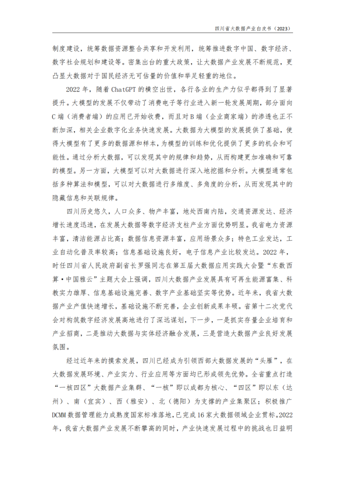 大数据产业是以数据生成、采集、存储、加工、分析、服务为主的战略性新兴产业,是激活数据要素潜能的关键支撑,是加快经济社会发展质量变革、效率变革、动力变革的重要引擎。近年来,我国的大数据从基础设施、技术路线到应用场景日趋完善,数据作为新型生产要素在宏观决策、市场调配和民生保障领域发挥了巨大的作用。数据具有无形性、非消耗性等特点,可以接近零成本无限复制,对传统产权、流通、分配、治理等制度提出新挑战,亟需构建与数字生产力发展相适应的生产关系,不断解放和发展数字生产力。
