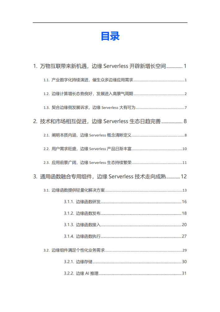 本白皮书梳理了边缘Serverless的发展背景,给出了边缘Serverless的清晰定义,分析了边缘Serverless的市场趋势,深度剖析了边缘Serverless的战略价值,详细解析了边缘Serverless的技术要点。本白皮书从技术实践出发,对比了边缘Serverless解决方案较传统模式带来的显著变化与优势。充分展现了边缘Serverless的实际效用与现实价值。最后,本白皮书对边缘Serverless的未来发展进行了展望。