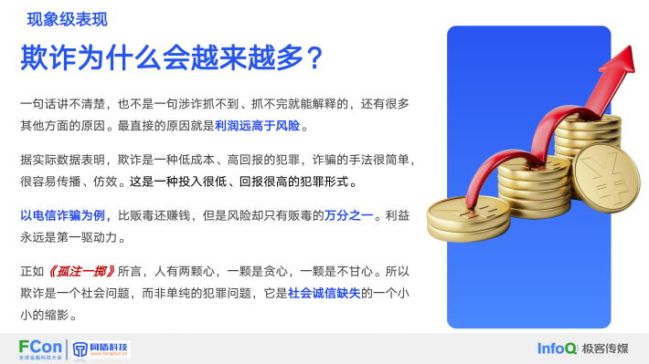据实际数据表明,欺诈是一种低成本、高回报的犯罪,诈骗的手法很简单,很容易传播、仿效。这是一种投入很低、回报很高的犯罪形式。