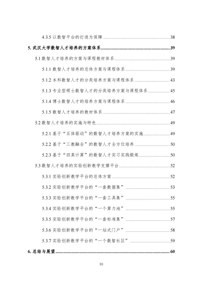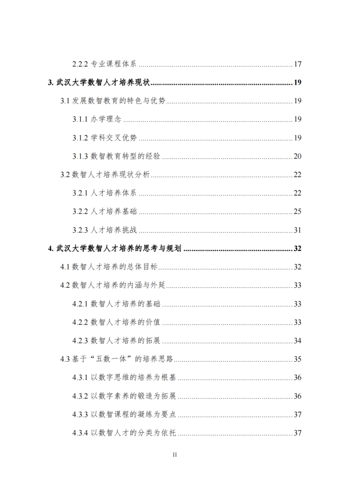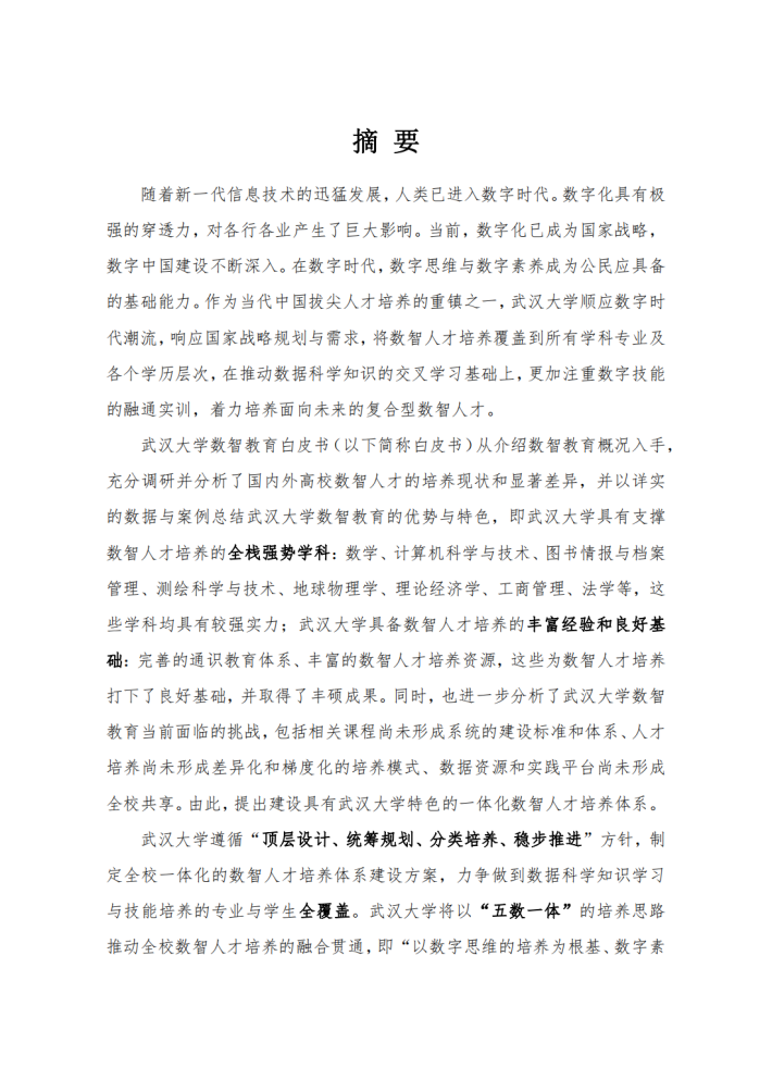 武汉大学数智教育白皮书(以下简称白皮书)从介绍数智教育概况入手,充分调研并分析了国内外高校数智人才的培养现状和显著差异,并以详实的数据与案例总结武汉大学数智教育的优势与特色,即武汉大学具有支撑数智人才培养的全栈强势学科:数学、计算机科学与技术、图书情报与档案管理、测绘科学与技术、地球物理学、理论经济学、工商管理、法学等,这些学科均具有较强实力;武汉大学具备数智人才培养的丰富经验和良好基础:完善的通识教育体系、丰富的数智人才培养资源,这些为数智人才培养打下了良好基础,并取得了丰硕成果。同时,也进一步分析了武汉大学数智教育当前面临的挑战,包括相关课程尚未形成系统的建设标准和体系、人才培养尚未形成差异化和梯度化的培养模式、数据资源和实践平台尚未形成全校共享。由此,提出建设具有武汉大学特色的一体化数智人才培养体系。