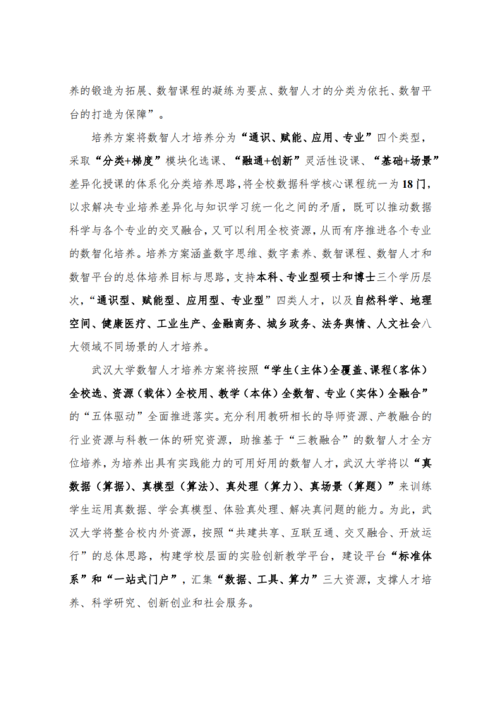 随着新一代信息技术的迅猛发展,人类已进入数字时代。数字化具有极强的穿透力,对各行各业产生了巨大影响。当前,数字化已成为国家战略,数字中国建设不断深入。在数字时代,数字思维与数字素养成为公民应具备的基础能力。作为当代中国拔尖人才培养的重镇之一,武汉大学顺应数字时代潮流,响应国家战略规划与需求,将数智人才培养覆盖到所有学科专业及各个学历层次,在推动数据科学知识的交叉学习基础上,更加注重数字技能的融通实训,着力培养面向未来的复合型数智人才。