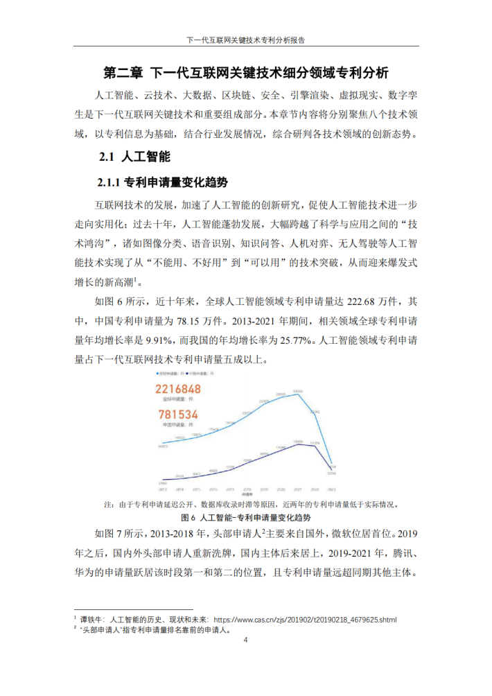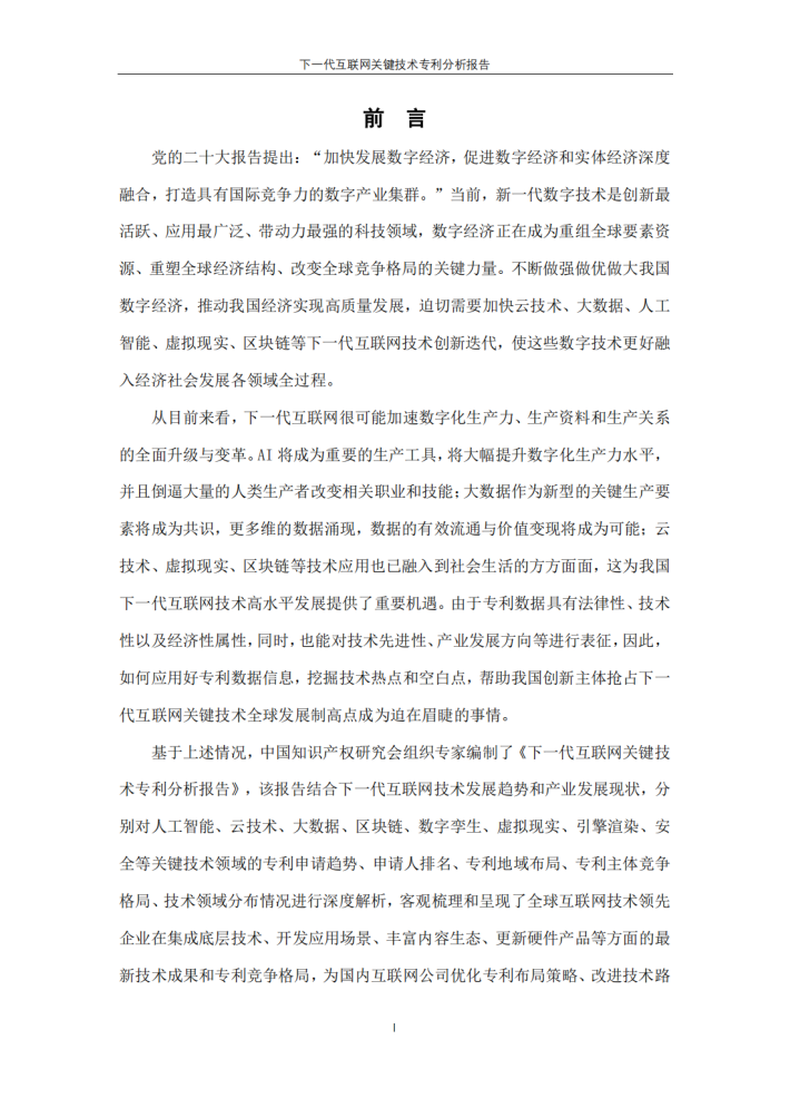 从目前来看,下一代互联网很可能加速数字化生产力、生产资料和生产关系的全面升级与变革。AI将成为重要的生产工具,将大幅提升数字化生产力水平,并且倒逼大量的人类生产者改变相关职业和技能;大数据作为新型的关键生产要素将成为共识,更多维的数据涌现,数据的有效流通与价值变现将成为可能;云技术、虚拟现实、区块链等技术应用也已融入到社会生活的方方面面,这为我国下一代互联网技术高水平发展提供了重要机遇。由于专利数据具有法律性、技术性以及经济性属性,同时,也能对技术先进性、产业发展方向等进行表征,因此,如何应用好专利数据信息,挖掘技术热点和空白点,帮助我国创新主体抢占下一代互联网关键技术全球发展制高点成为迫在眉睫的事情。