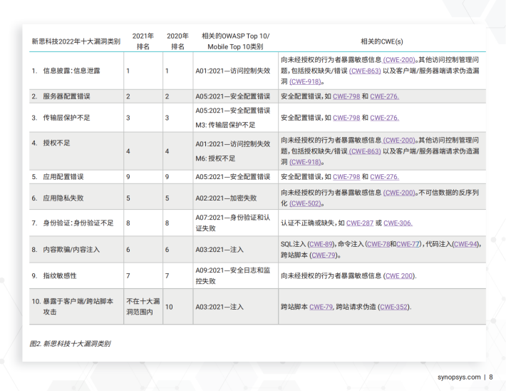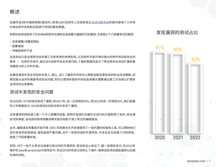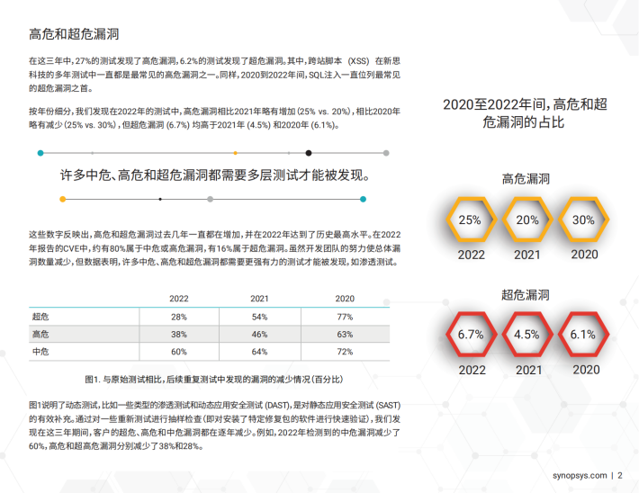 在这三年中,27%的测试发现了高危漏洞,6.2%的测试发现了超危漏洞。其中,跨站脚本(XSS)在新思科技的多年测试中一直都是最常见的高危漏洞之一。同样,2020到2022年间,SQL注入一直位列最常见的超危漏洞之首。