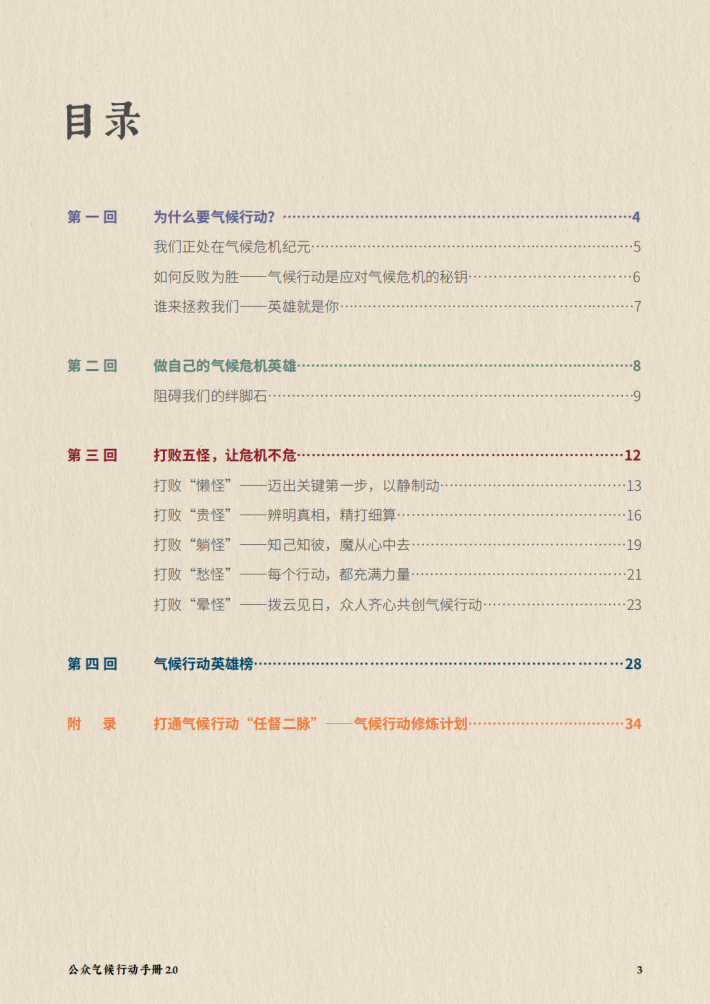 为此,去年我们发布了《公众气候行动手册》1.0版,借鉴了联合国政府间气候变化专门委员会(IPCC)第六次评估报告中提出的需求侧能够开展的60种气候行动,将公众划分为潜力、参与、创变三个阶段,并按照居家、办公和休闲娱乐三大场景,为处于不同阶段的人群提供更有针对性、更适合的气候行动指南,使之更贴近生活、更有趣、更易行,帮助公众更好地在日常中践行气候行动。