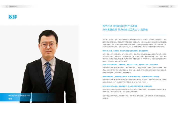 伊拉克是最早同新中国建交的阿拉伯国家之一,2015年12月,中伊两国发表联合声明,宣布建立战略伙伴关系,开启了中伊友好新篇章。建交以来,两国牢牢把握双边关系发展方向,始终相互理解、相互信任、相互支持。值此共建“一带一路”倡议提出十周年和中伊建交65周年之际,我谨代表中国驻伊拉克大使馆,对本报告的发布表示祝贺。以本报告为基础,中资企业将携手各利益相关方,开创中伊战略伙伴关系美好的未来。