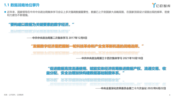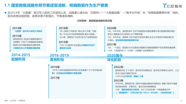 自2014年“大数据”首次写入政府工作报告以来,战略重心逐步由“互联网+”—“大数据战略”一“数字化升级”向“培育数据要素市场”倾斜。