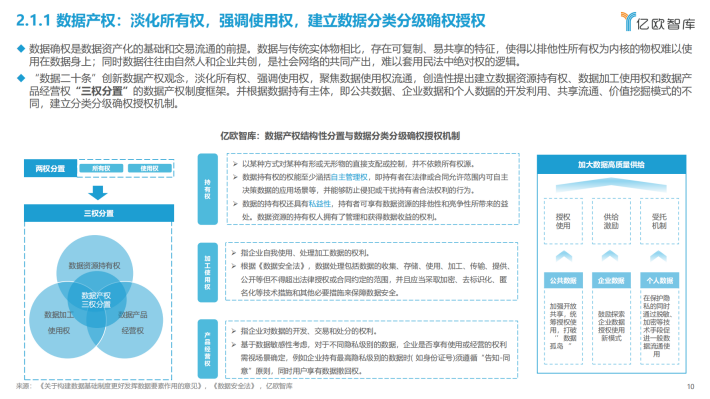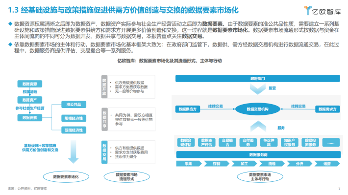 数据资源权属清晰之后即为数据资产,数据资产实际参与社会生产经营活动之后即为数据要素。由于数据要素的准公共品性质,需要建立一系列基础设施和政策措施促进数据要素供给方和需求方开展更多价值创造和交换,这一过程就是数据要素市场化。数据要素市场流通形式按数据与资金在主体间流向的不同可分为数据开发、数据共享与数据交易,本报告重点关注数据交易。