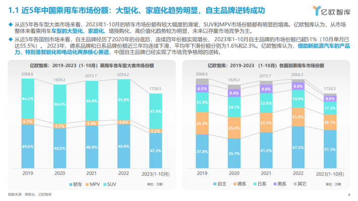 从近5年各车型大类市场来看,2023年1-10月的轿车市场份额有较大幅度的滑坡,SUV和MPV市场份额都有明显的增高。亿欧智库认为,从市场整体来看乘用车车型的大型化、家庭化、增换购化、高价值化趋势较为明显,未来以存量市场竞争为主。