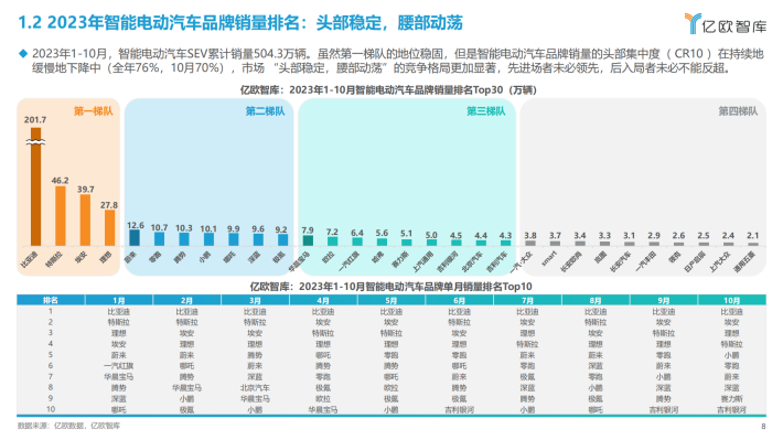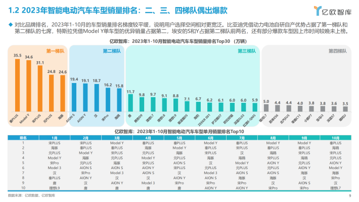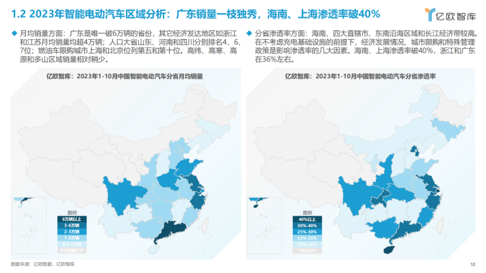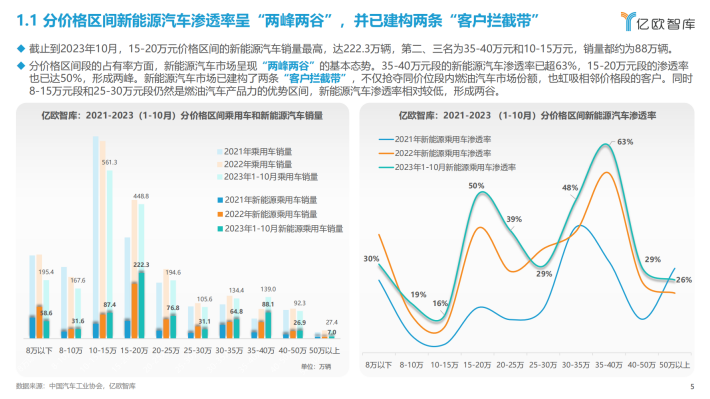 截止到2023年10月,15-20万元价格区间的新能源汽车销量最高,达222.3万辆,第二、三名为35-40万元和10-15万元,销量都约为88万辆。分价格区间段的占有率方面,新能源汽车市场呈现“两峰两谷”的基本态势。35-40万元段的新能源汽车渗透率已超63%,15-20万元段的渗透率也已达50%,形成两峰。新能源汽车市场已建构了两条“客户拦截带”,不仅抢夺同价位段内燃油汽车市场份额,也虹吸相邻价格段的客户。同时8-15万元段和25-30万元段仍然是燃油汽车产品力的优势区间,新能源汽车渗透率相对较低,形成两谷。