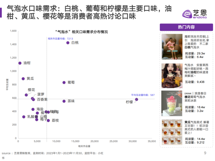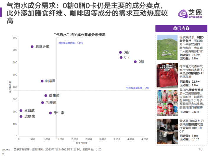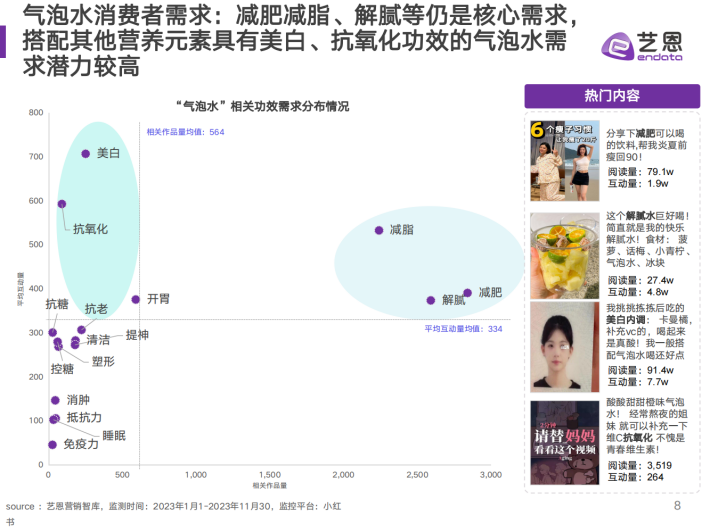 从市场需求来看,减肥减脂、解腻等仍是核心需求,搭配其他营养元素具有美白、抗氧化功效的气泡水需求潜力较高;在口味方面,白桃、葡萄和柠檬是主要口味,油柑、黄瓜、樱花等网红口味在今年的互动热度更高;另外随着市场竞争的加剧,气泡水品牌开始在原料上做内功,添加膳食纤维、咖啡因等成分的气泡水产品热度增高。