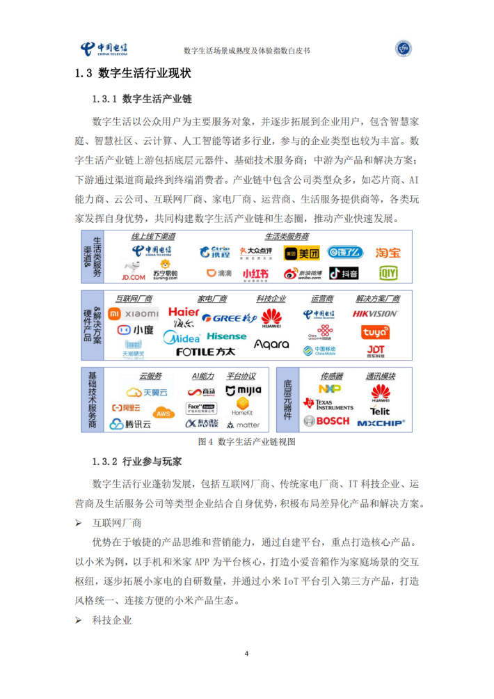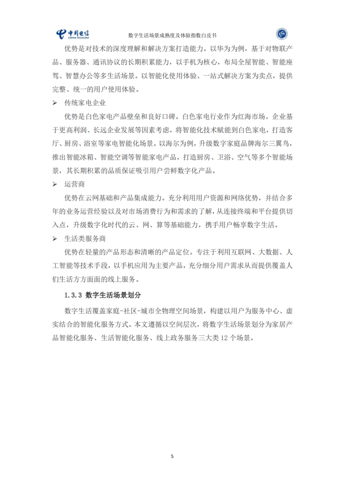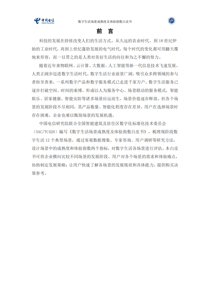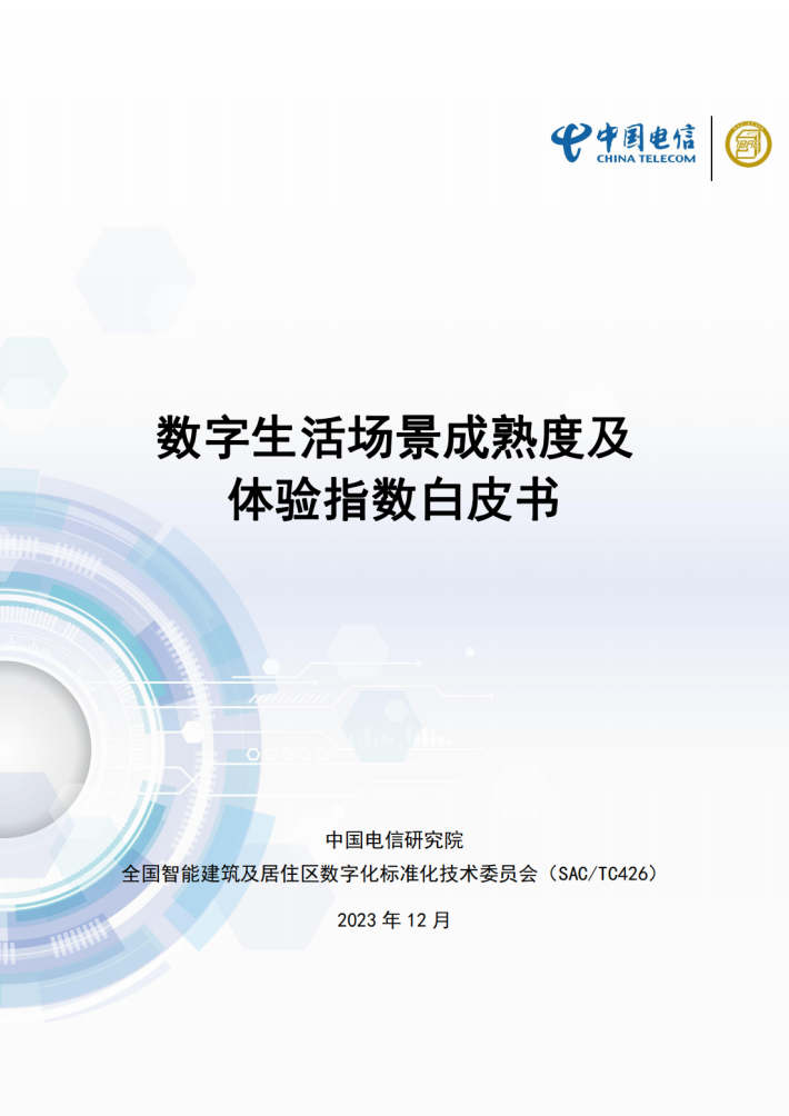 中国电信研究院联合全国智能建筑及居住区数字化标准化技术委员会(SAC/TC426)编写《数字生活场景成熟度及体验指数白皮书》,梳理现阶段数字生活12个典型场景,通过客观数据搜集、专家咨询、用户调研等研究方法,设计场景中的成熟度和体验指数两个指标,对数字生活各场景进行评估。本白皮书可供企业横向比较不同场景的发展阶段、用户对各个场景的需求和体验痛点,协助制定发展策略;让用户快速了解各场景的发展现状和具体能力,提供购买决策参考。